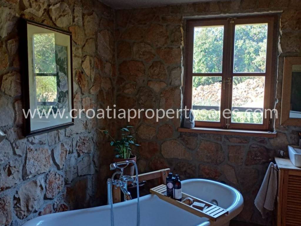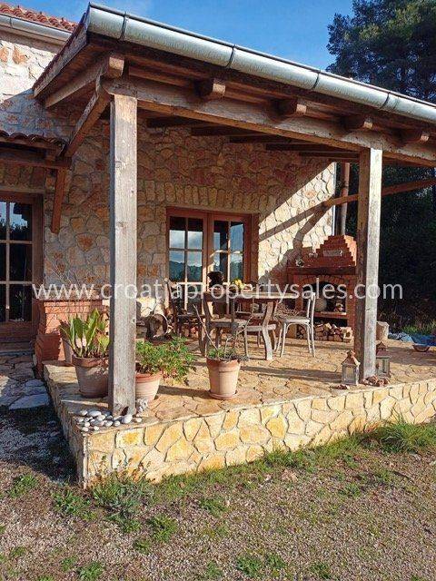 U prodaji je autohtono imanje sa šarmantnom kamenom kućom, smješteno  u srcu otoka Visa, omeđeno prirodom i borovom šumom.Kuća ima neku posebnu umjetničku notu, sam interijer odiše kreativnošću.Romantična samostojeća kuća sastoji se od jedne spavaće sobe, koja se nalazi u potkrovlju. Ima izlaz na terasu sa zadivljujućim pogledom na zelenilo i šumu.U prizemlju se nalazi kuhinja, dnevni boravak i velika kupaona sa kadom i ugradbenim ormarima. Tu je i peć na drva, koja zimi pruža posebnu toplinu ovog doma.Iz kuće se izlazi na natkrivenu prostranu terasu.Na samoj parceli nalaze se još 2 bungalova svaki površine 28m2, koji se koriste u ljetnim mjesecima. Ispred kuće prostire se 12 000 m2 visoko plodne zemlje, trenutno nezasađene, ali može poslužiti za sadnju maslinika, ili vinograda.Od infrastrukture, kuća ima vodu, kanalizaciju, a struju pomoću solarnih panela. Kuća ima i osiguran parking, ali i samostojeću garažu površine oko 20 m2.