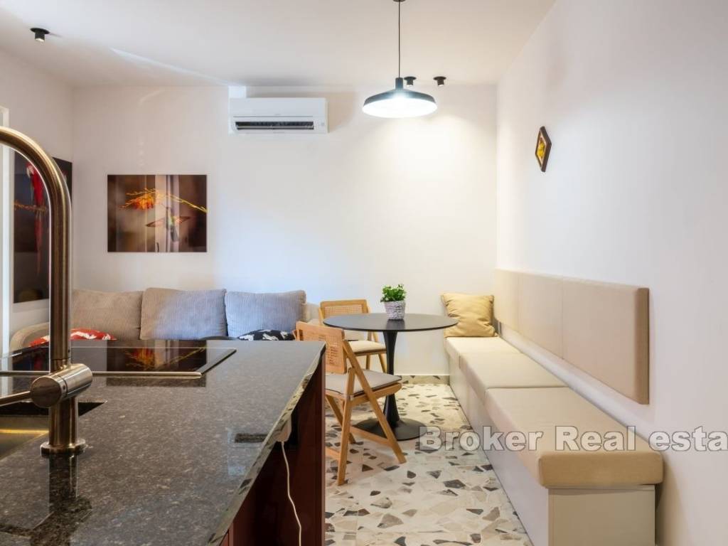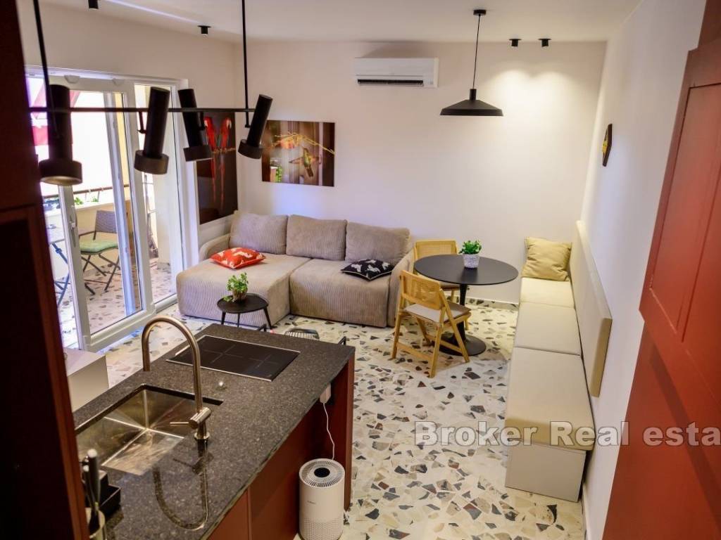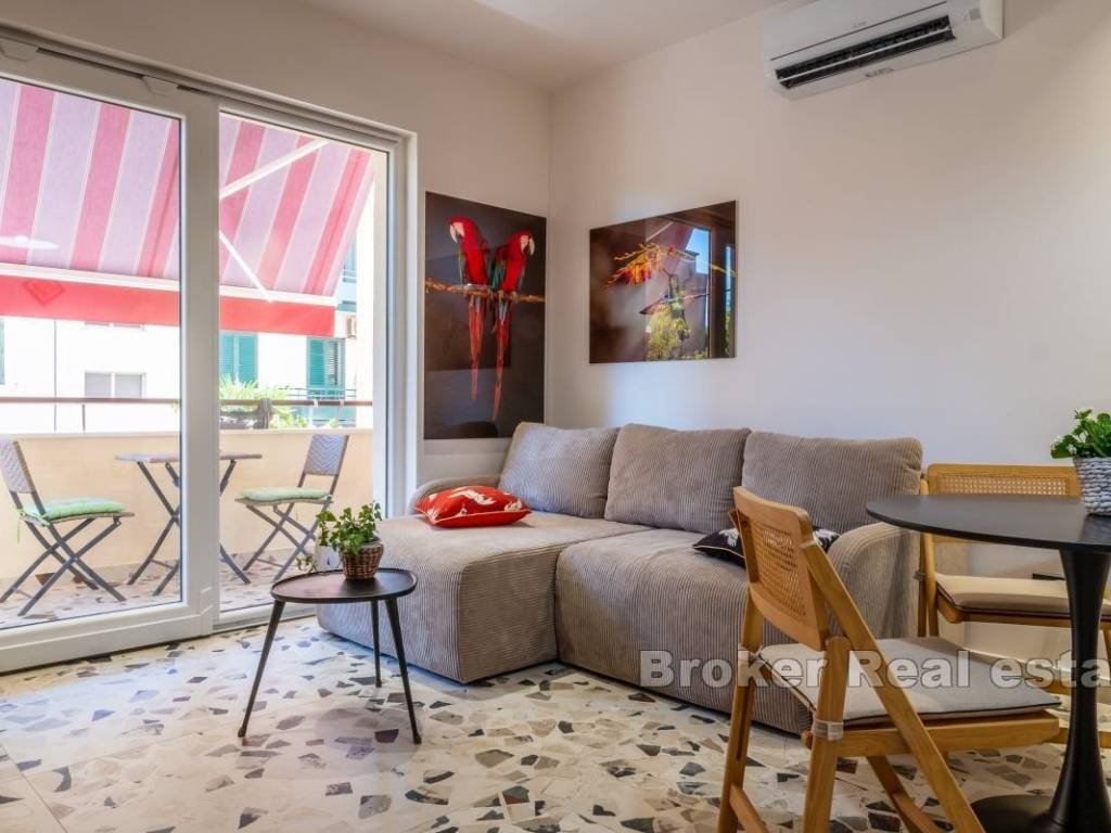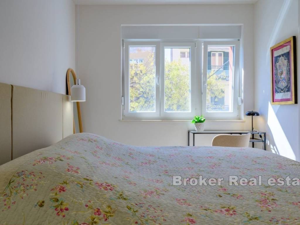Iznajmljuje se dugoročno potpuno namješten i opremljen stan na 1. katu stambene zgrade na elitnoj lokaciji, Bačvicama. Stan je površine 48 m2, cijeli orijentiran na jugu. Sastoji se od jedne, klimatizirane spavaće sobe, kuhinje s blagovaonicom i prostranim, dnevnim boravkom u jedinstvenom prostoru. Stan također posjeduje balkon južne orjentacije. Obzirom na položaj, cijeli prostor je osunčan tokom cijelog dana. U slučaju ovog stana, valja napomenuti da se radi o stanu koji je nedavno potpuno renoviran i u čiju se renovaciju i opremanje dosta uložilo. Lokacija stana je vrlo mirna, a u blizini su svi potrebni sadržaji. Plaže, trgovine, brojni restorani, škola i vrtići. Iz stana se do srca grada dođe pješice za 10 minuta. * S obzirom na promjenjivost i dinamiku iznajmljivanja, oglas je informativnog karaktera te ne mora nužno značiti da je ovaj stan dostupan za najam.