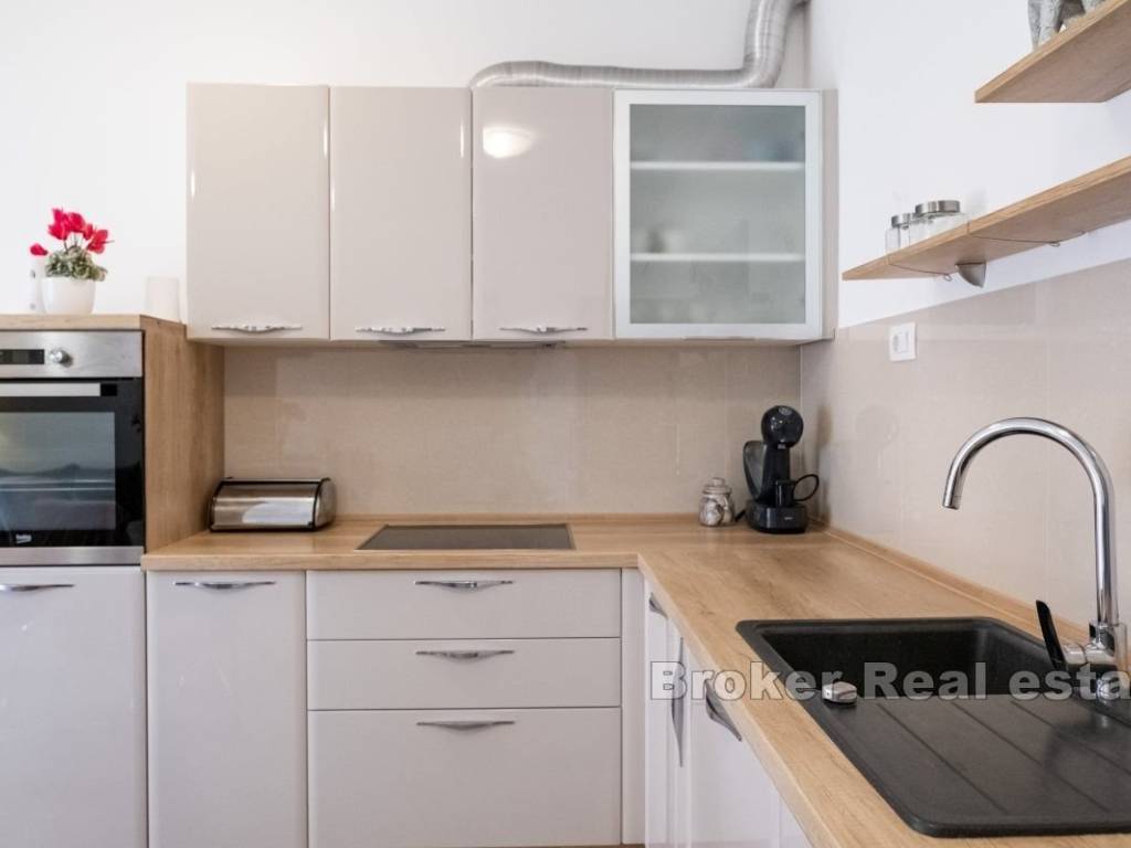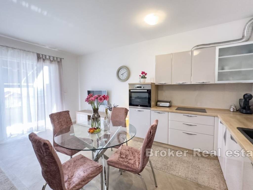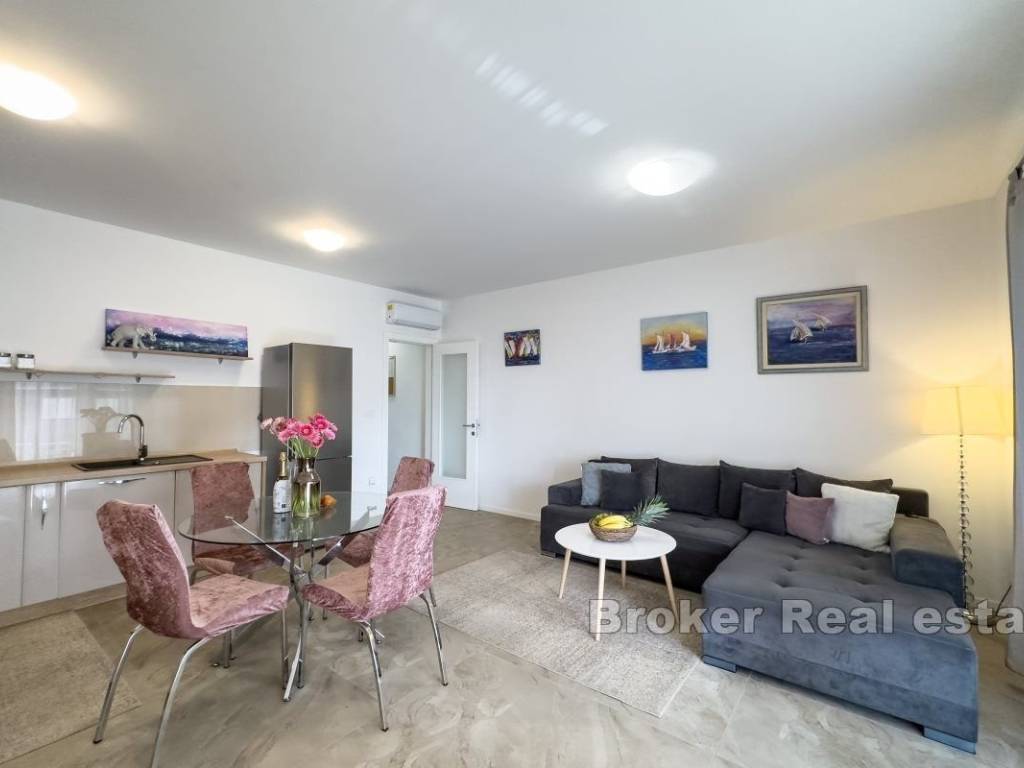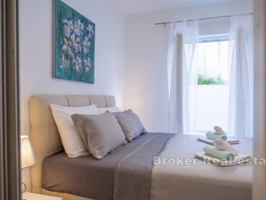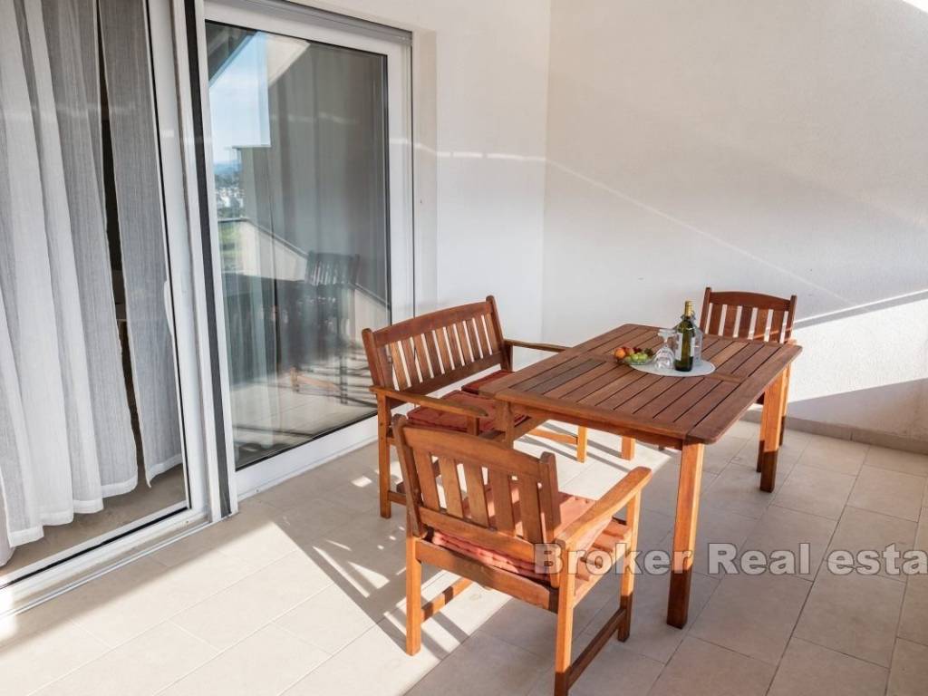 Smješten je na uzvišenom dijelu u manjoj zgrade na visokom prizemlju. Na sjevernoj strani smješten je mali vrt. Ulaskom u apartman s lijeve strane nalaze se dvije spavaće sobe. Manja je dječja jednokrevetna, a veća master soba posjeduje walk in ormar, na kraju hodnika nalazi se i kupatilo s tuš kabinom. U hodniku se nalaze veliki zidni ormari za dodatni prostor. Kuhinja, blagovaonica i dnevni boravak spojeni su u jedan veliki prozračni prostor s izlazom na prostranu lođu južne orijentacije. Stanu pripada privatno parking mjesto odmah ispred zgrade. Ovaj moderno opremljen apartman nalazi se u Strožancu. Udaljen svega 10 km od stare jezgre grada Splita, plaža je na 10 minuta hoda,Omiš je udaljen 10 km,a zračna luka 20 km od apartmana. Nalazi se u blizini svih sadržaja potrebnih za idealan život.Trgovine,caffe barovi,restorani, plaže,teretana,golf tereni, igralište za djecu te šetnica uz rijeku Žrnovnicu.