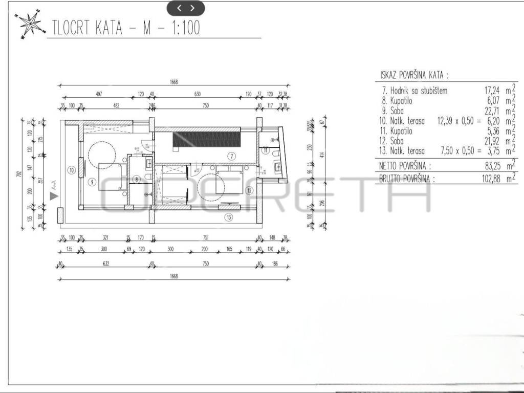 Elegantnim stubištem dolazimo na drugu etažu kuće gdje se nalaze dvije prostrane spavaće soba sa vlastitim luksuzno opremljenim kupaonama. U potkrovlju se nalazi glavna soba sa vlastitom kupaonicom te se može pohvaliti veličanstvenom terasom s koje se pruža prekrasan panoramski pogled na more.