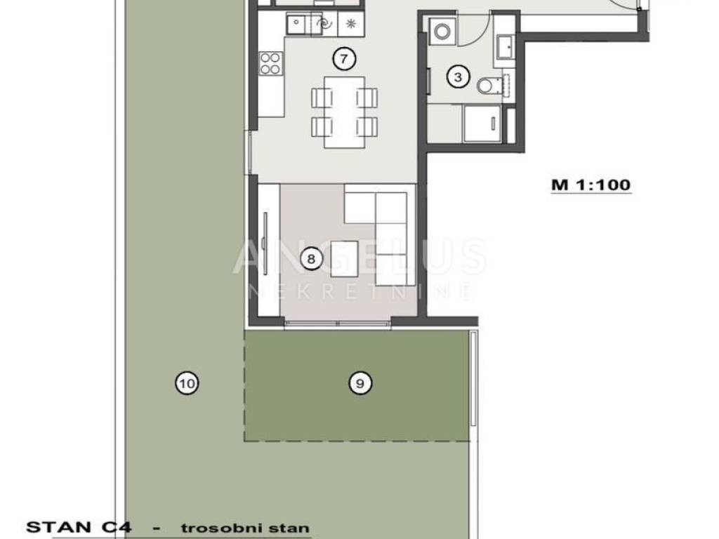 Prodaje se trosoban stan u novogradnji  ukupne neto  površine od 96.29 m2, sa prostranim vrtom, položen u prizemlju stambene zgrade, J-Z orijentacije. Stan se sastoji od ulaznog hodnika, kuhinje i blagovaonice s dnevnim boravkom, tri spavaće sobe,  kupaonice, wc-a i velikog vrta (ukupne bruto površine 100.82 m2). Zgrada lijepe arhitekture i visoke energetske učinkovitosti gradi se prema suvremenim standardima od vrlo kvalitetnih materijala sa svom potrebnom opremom. Zgrada ima dvije podrumske garaže sa parkirnim mjestima, prizemlje, tri  kata i nadgrađe. Predviđen je jedan ulaz s liftom koji povezuje sve etaže. Cijena parkirnog mjesta u podrumskoj etaži iznosi 2.000 eur po m2. Zgrada zbog svoje orijentacije je osunčana cijeli dan i ima prekrasan otvoreni pogled.