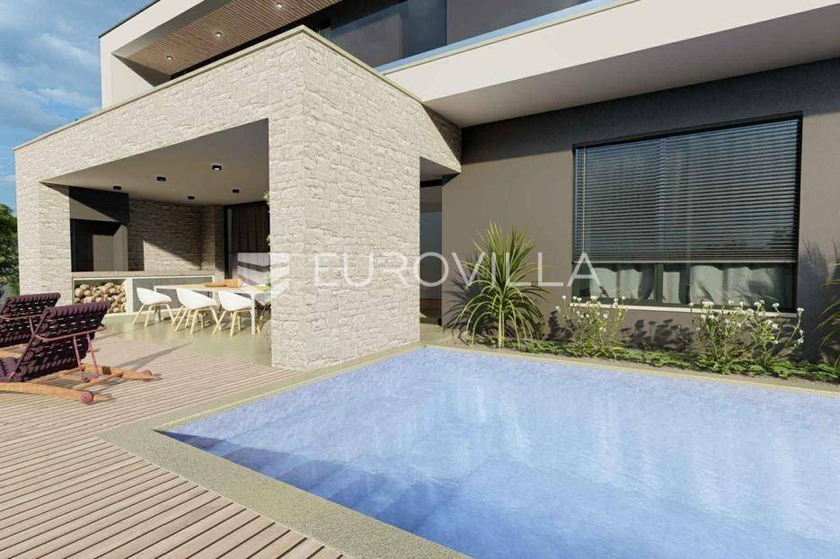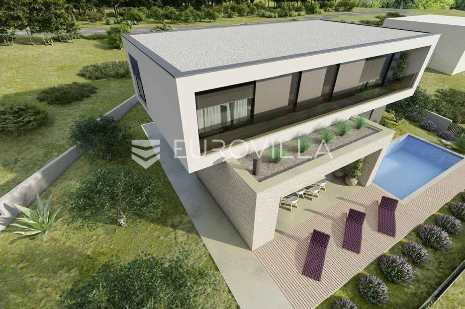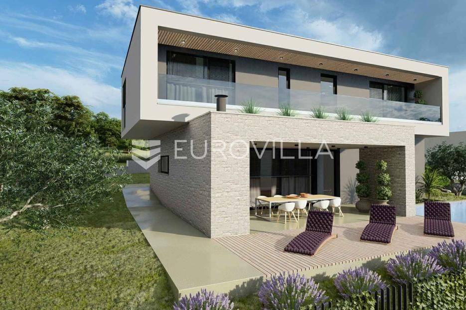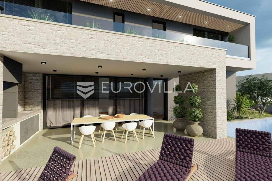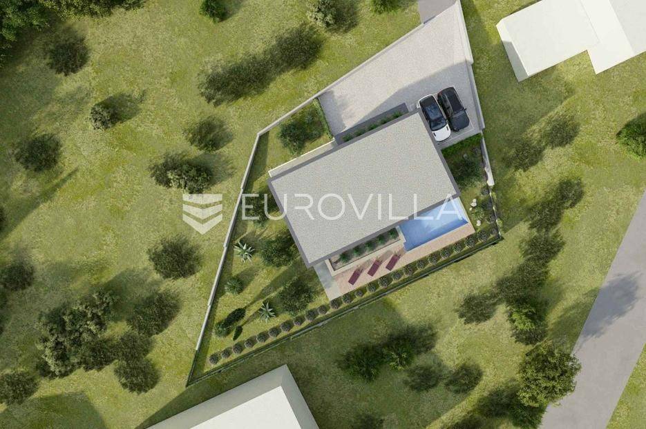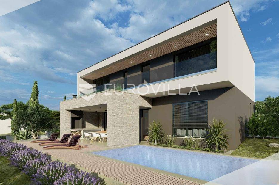 Na prodaju je atraktivno građevinsko zemljište površine 897 m2, smješteno u mirnom predjelu s prekrasnim pogledom na more. Uz zemljište dolazi pravomoćna građevinska dozvola i gotov projekt za izgradnju moderne kuće s bazenom.Predviđena kuća bruto površine 203,10 m2 sastoji se od prizemlja i kata. U prizemlju se nalaze dnevni boravak povezan s kuhinjom i blagovaonicom, jedna spavaća soba, kupaonica, spremište te natkrivena terasa, dok se na katu nalaze tri spavaće sobe, svaka sa svojom kupaonicom.Sva potrebna infrastruktura, uključujući priključke za vodu i struju, nalazi se neposredno uz zemljište, a budući da je građevinska dozvola pravomoćna, s gradnjom se može započeti odmah.Ova nekretnina predstavlja izvrsnu priliku za izgradnju luksuzne vile za osobnu upotrebu ili kao investiciju za turistički najam.Za sve dodatne informacije ili dogovor oko razgledanja, slobodno se javite.