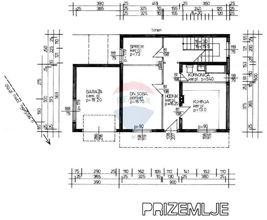 Na 1. katu su 3 spavaće sobe i kupaonica. Neuređeno potkrovlje, dovoljno visoko da se može iskoristiti sav prostor, a zbog dodatnog ulaza u kuću moguće je dobivanje dodatnog stana