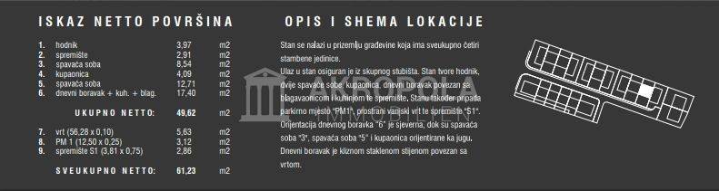 Stan se sastoji od : hodnika, spremišta, kupatila, 2 spavaće sobe, Dnevni boravak+ kuhinja+ blagovaona ukupna neto površina 49,62 m2.