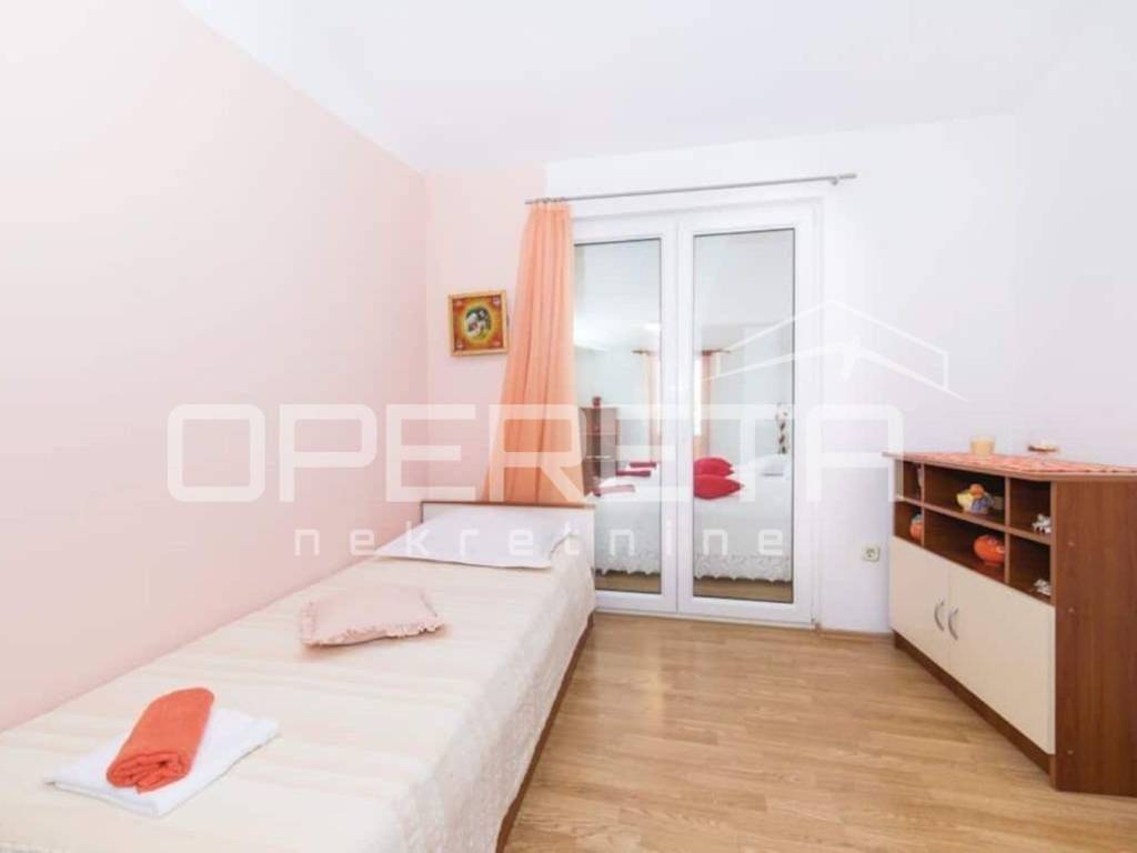 U prizemlju se nalazi funkcionalan apartman s dvije spavaće sobe, kuhinjom, blagovaonicom, dnevnim boravkom i kupaonicom, s izravnim pristupom vrtu i bazenu. Na katu se prostire prostran i svijetao stan s tri spavaće sobe, dvije kupaonice, moderno opremljenom kuhinjom, blagovaonicom i dnevnim boravkom koji vodi na natkrivenu terasu s prekrasnim pogledom na more. Interijer odiše toplinom i suvremenim dizajnom, s naglaskom na udobnost i kvalitetne materijale.