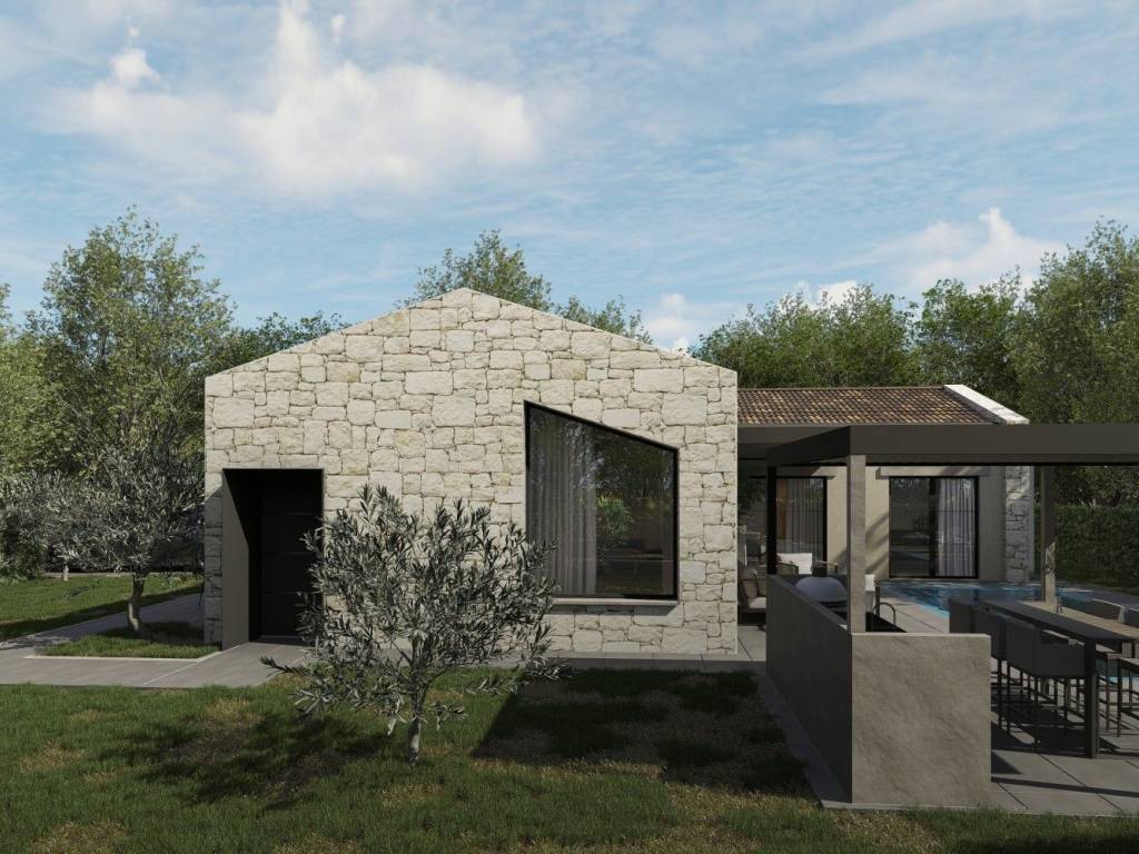 Prekrasna prizemnica sa bazenom modernog dizajna, udaljena cca 5 km od Poreča i mora- kuća je površine 150 m2 na parceli od 735 m2- ova prekrasna prizemnica nudi privatnost- kuća se sastoji od hodnika, dnevnog boravka, kuhinje, blagovaone, 3 spavaće sobe, 3 kupatila, wc-a i spremišta- u dvorištu se nalazi bazen, sunčalište, lounge, ljetna kuhinja i terasa- te taj vanjski dio čini ca 95 m2. Parkirna mjesta za 3 automobila.