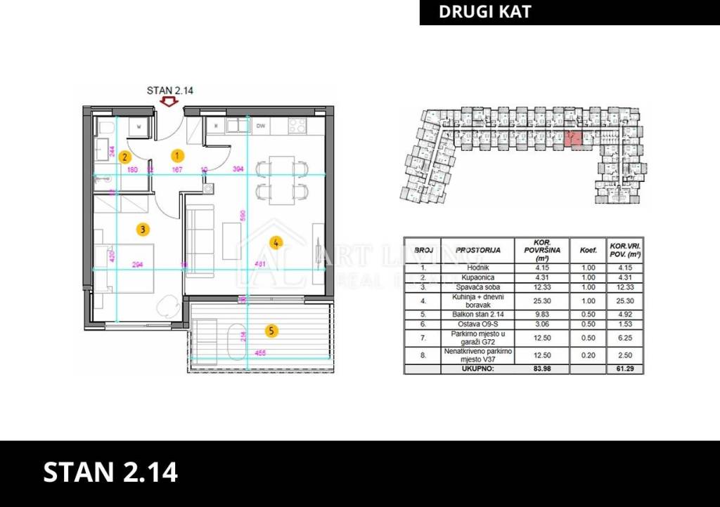 Stan je smješten na 2. katu nove moderne zgrade sa liftom. Ukupna neto površina stana iznosi 61,29 m2. Sastoji se od dnevnog boravka sa kuhinjom i blagovaonicom, kupaonice i spavaće sobe. Iz dnevnog boravka se izlazi na balkon površine 9,83 m2. Stanu pripada spremište, jedno parkirno mjesto u garaži i jedno vansko parkirno mjesto.