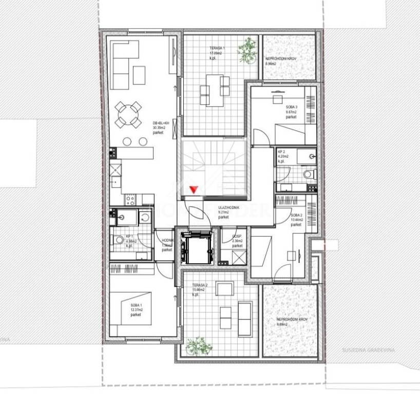 Prostran raspored: Stan se sastoji od 3 sobe, prostranog dnevnog boravka (30,35 m²), 2 kupaonice, hodnika i gospodarske prostorije. Također, stan ima 2 terase (17,09 m² i 15,66 m²) idealne za uživanje u mirnim trenucima na otvorenom.