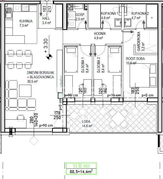 Prodaje se stan površine 88,5 m2 s lođom površine 14,6 m2 na 1. katu niskoenergetske stambeno – poslovne zgrade na odličnoj lokaciji. Zgrada se sastoji od podruma, visokog prizemlja, prvog, drugog i trećeg kata te sadrži ukupno 74 stambene jedinice i 7 poslovnih prostora. Završetak gradnje predviđen je krajem 2025./početak 2026. Energetski razred je A+. Moguć je odabir podnih obloga (keramika, parket ili laminat) te odabir unutarnje stolarije. Uz stan moguća je kupovina i vanjskog parkirnog mjesta po cijeni od 8.000,00 EUR, garažnog mjesta bez spremišta po cijeni od 14.000,00 EUR, garažnog mjesta sa spremištem do 17,4 m2 po cijeni od 17.500,00 EUR, garažnog mjesta sa spremištem do 19,4 m2 po cijeni od 19.500,00 EUR ili garažnog mjesta sa spremištem do 20,6 m2 po cijeni od 22.500,00 EUR.