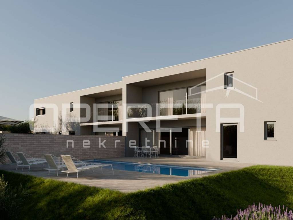 Ova moderna dvojna kuća smještena je na parceli površine 500 m², na otoku Krku a obuhvaća 157 m² unutarnjeg prostora raspoređenog na dva kata, uz 18 m² natkrivene terase i bazen površine 32 m². Nalazi se u mirnom području, s predivnim pogledom na more i susjedni otok.