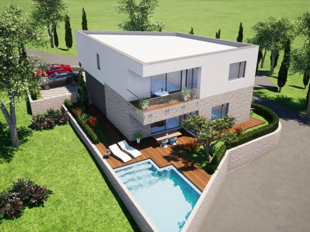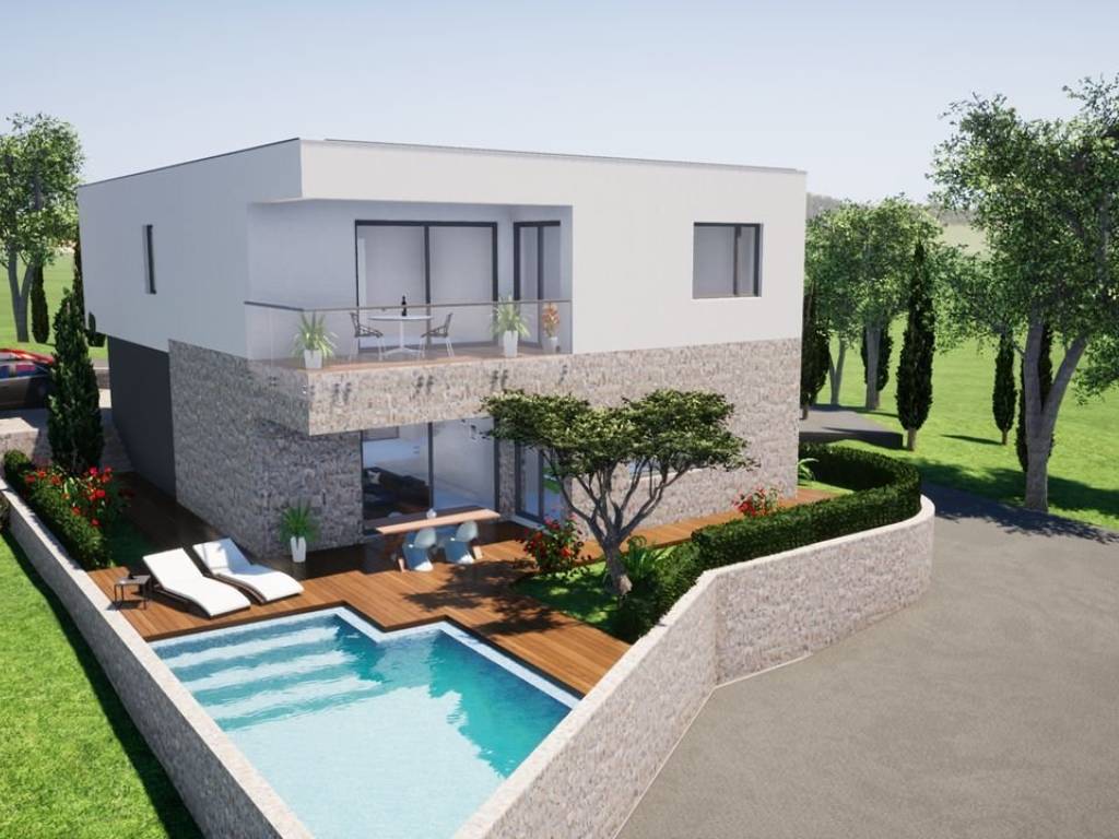 Vodice nova vila (građ.površina bez i sa koeficijentom 282/242 m2) sa bazenom (slana voda, automatika i mogućnost grijanja vode i protustrujno plivanje)na mirnoj lokaciji sa pogledom na more i udaljenom 400m do plaže.