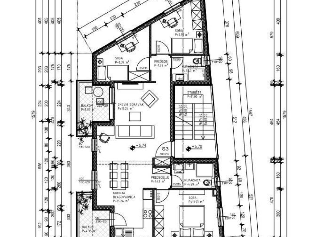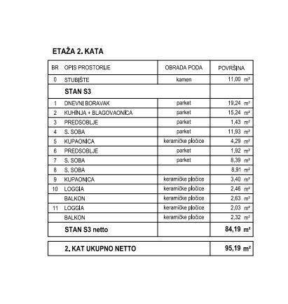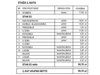 • predsoblje • dnevni boravak • kuhinja sa blagovaonicom • tri spavaće sobe • dvije kupaonice • dvije lođe s balkonom • krovna terasa na drugoj etaži, 84.19 m2 Uz stan je uključeno i pripadajuće garažno mjesto.