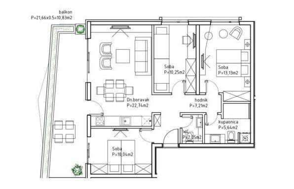 U ovom modernom kompleksu prodaje se trosoban stan površine 81,89 m2.