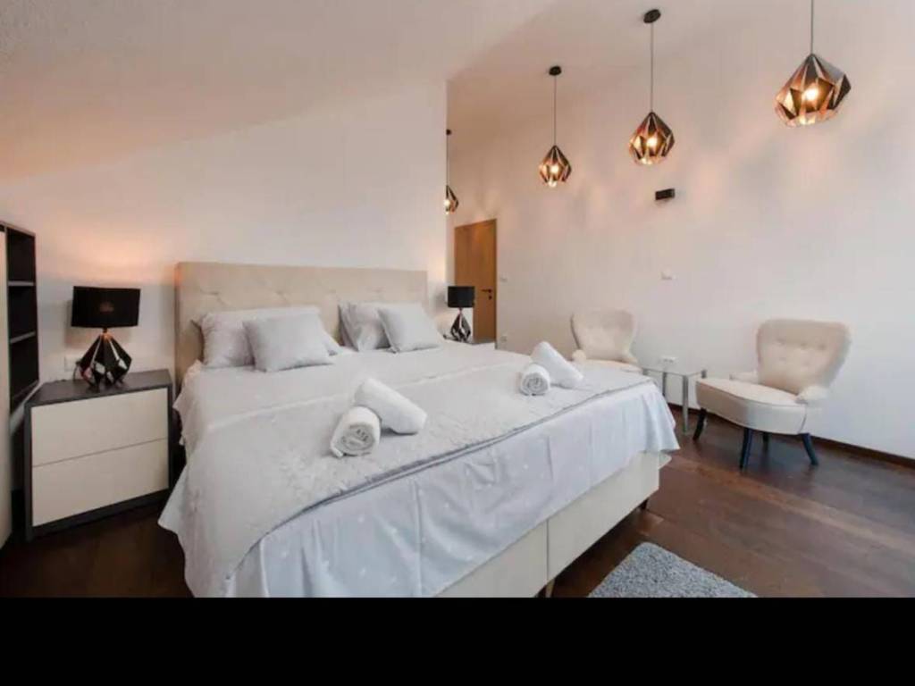 Vila se nalazi u nasadu maslina u malom mjestu na otoku Braču sa istočne strane, okružena samo prirodom i lijepom šumom, smještena na 100m od mora. Moderno opremljene, izgrađene u 2021. godini, sadrže 3 spavaće sobe (16 m2) (svaka ima TV i klimu) s tri luksuzna toaleta (6 m2) s walk-in tuševima i jednom dodatnom kadom (9m2) Vani se nalazi bazen s ležaljkama i suncobranima, veliki kamin za roštiljanje i opuštanje u prekrasnom pogledu.