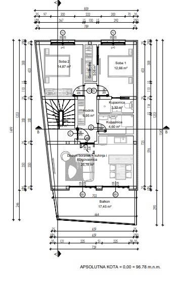 Stan se nalazi na 2.katu novoizgrađene stambene zgrade. Površina stambenog prostora iznosi 71.26 m2. Stan se sastoji od dnevnog boravka sa kuhinjom i blagovaonicom open space koncepta, 2 spavaće sobe, 2 kupaonice, garderobne prostorije i hodnika. Iz dnevnog boravka se izlazi na prostranu natkrivenu terasu površine 17.45 m2. Stepenicama se dolazi do krova gdje se nalazi prostrana terasa sa koje se pruža lijepi pogled na more i na prirodu. Površina natkrivenog dijela krovne terase iznosi 50.67 m2, dok površina nenatkrivenog dijela iznosi 42.23 m2. Na krovu je izvedena priprema za jacuzzi.
