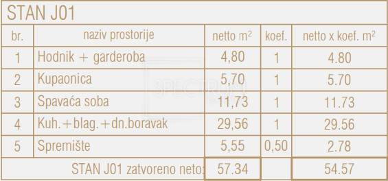 Stan se nalazi u prizemlju novoizgrađenog stambeno - poslovnog kompleksa koji se sastoji od centralnog, južnog i sjevernog dijela. Površina stana iznosi 54.57 m2. Stan se sastoji od dnevnog boravka zajedno sa kuhinjom i blagovaonicom, spavaće sobe, kupaonice, hodnika i ostave. Stan se prodaje po sistemu „ključ u ruke" s kompletno uređenom kupaonicom (namještaj i sanitarije), podnim oblogama u svim prostorijama (keramika 1. klase, laminat), provedenim elektroinstalacijama, ugrađenim klima uređajem, unutarnjom stolarijom, vanjskom PVC ili ALU stolarijom, protuprovalnim i protupožarnim ulaznim vratima, antenskim sustavom, UTP mrežom, te zidovima i stropovima bijele boje.