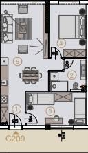 Stan se nalazi na 2.katu novoizgrađenog stambeno - poslovnog kompleksa koji se sastoji od centralnog, južnog i sjevernog dijela. Površina stana iznosi 59.16 m2. Stan se sastoji od dnevnog boravka zajedno sa kuhinjom i blagovaonicom, 2 spavaće sobe, kupaonice i hodnika. Stan se prodaje po sistemu „ključ u ruke" s kompletno uređenom kupaonicom (namještaj i sanitarije), podnim oblogama u svim prostorijama (keramika 1. klase, laminat), provedenim elektroinstalacijama, ugrađenim klima uređajem, unutarnjom stolarijom, vanjskom PVC ili ALU stolarijom, protuprovalnim i protupožarnim ulaznim vratima, antenskim sustavom, UTP mrežom, te zidovima i stropovima bijele boje.