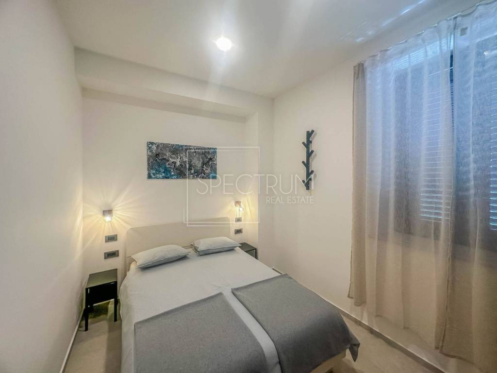 Stan se nalazi na 1.katu manje stambene zgrade. Površina stana iznosi 57.82 m2. Stan se sastoji od prostranog dnevnog boravka sa kuhinjom i blagovaonicom, 2 spavaće sobe, hodnika, kupaonice, wc-a i praonice. Iz stana se pruža pogled na more. Stan se grije putem klima uređaja, podnog grijanja u kupaonici, a postoji mogućnost i ugradnje peći na drva. Stan je kompletno renoviran prošle godine. Stan se prodaje kompletno opremljen i namješten.