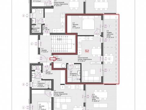Stan, 69,77 m2, sastoji se od spavaće sobe, kuhinje-blagovaone-dnevnog boravka, kupaonice/vešeraja, hodnika, natkrivene i nenatkrivene terase.