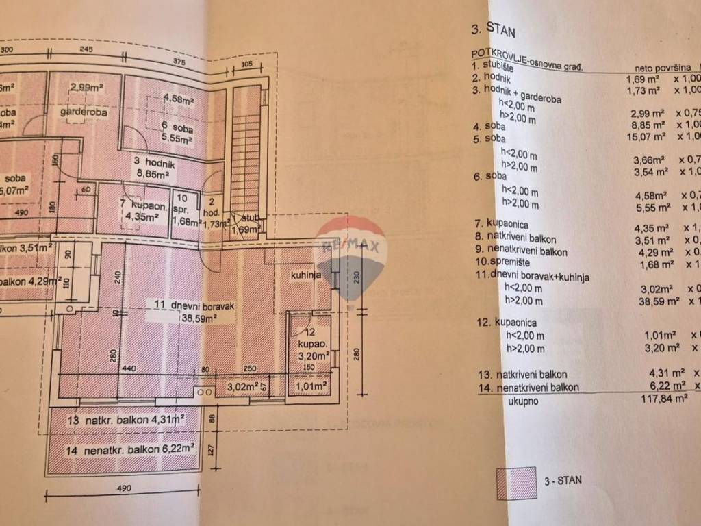 Predmetni stan se nalazi u visokom potkrovlju (visina prvog kata), a sastoji se od: 3 spavaće sobe, 2 kupaone, dnevnog boravka s kuhinjom i blagovaonom, garderobe, hodnika i 2 balkona.