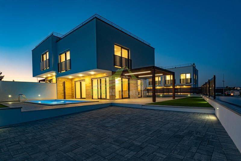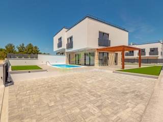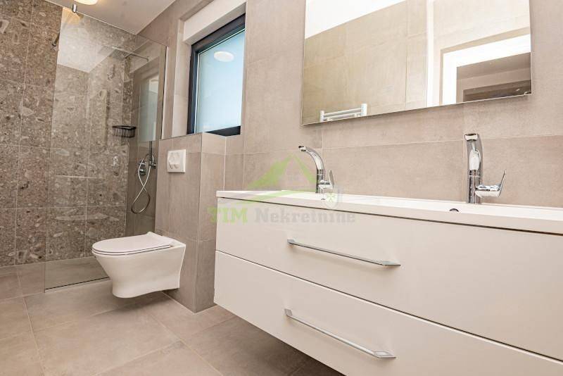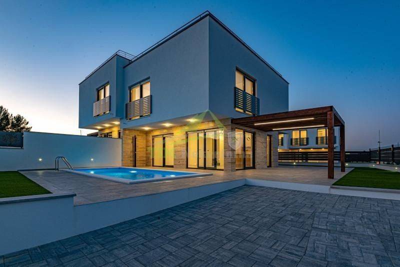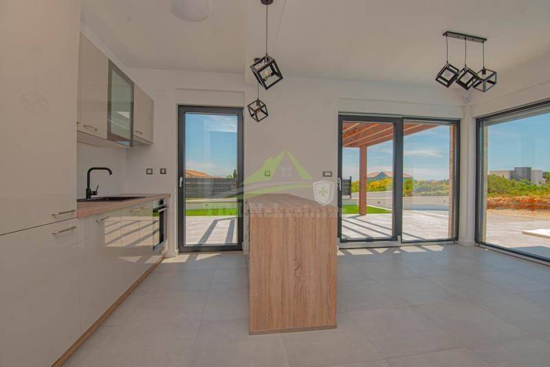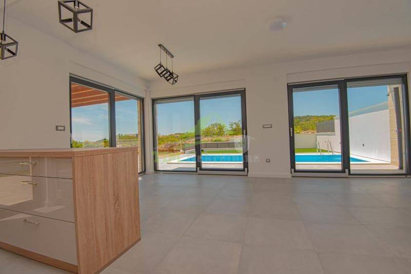 - kuhinjom s kuhinjskim otokom izrađenom po mjeri;- aluminijska stolarija s roletama na elektronskim podizačima;- podno grijanje u kupaonicama;- klima uređaj u svakoj zasebnoj prostoriji;- solarni kolektor za toplu vodu i spremnik od 300 l;- bazen površine 22 m2 s osnovnom opremom, bazen obložen folijom s pokrivačem za bazen- vanjski tuš sa spremnikom tople vode na solarno grijanje- bio-pročišćivač  i upojni bunar za odpadne vode;- tenda na elektronski pogon;- video nadzor s dvije vanjske pozicije;- protuprovalna vrata s kontrolom ulaza (otisak prsta i šifranik);- dio fasade u prizemlju obložen prirodnim kamenom. RASPORED:PRIZEMLJE:- predsoblje- kuhinja sa blagovaonicom i dnevnim boravkom- spremište- gostinski WC- unutarnje stubište za 1. kat