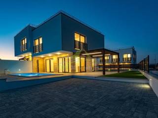 Novoizgrađena Villa u Vodicama sa pogledom na more je dio novog projekta koji se sastoji od ukupno 4 ville, smještene na rubnom dijelu naselja.Ukupna korisna površina ville iznosi 123 m2; sastoji se od dvije etaže, prizemlje + kat + prohodnu krovnu terasu.Krovna terasa ima površinu od 52 m2 na kojoj je sunčalište sa pripremom za mogući Jacuzzi.Okućnica je u potpunosti ograđena sa površinom od 200 m2 s prostranim parkirnim prostorom (za 2 mjesta), prostorom za vanjski roštilj te bazenom površine 22 m2.Villa je udaljena 1600 metar od plaže i 1300 m od centra grada.Građena je po visokom standardu kvalitete što dokazuje i energetski certifikat A+ klase, opremljena sa: