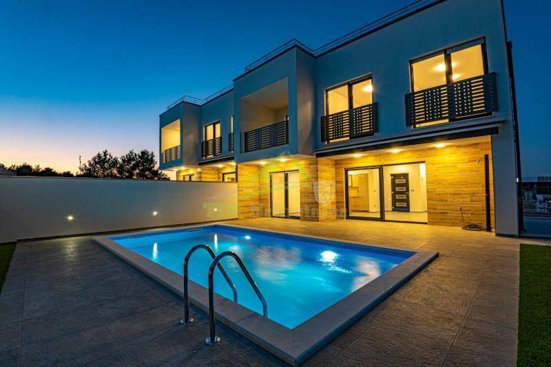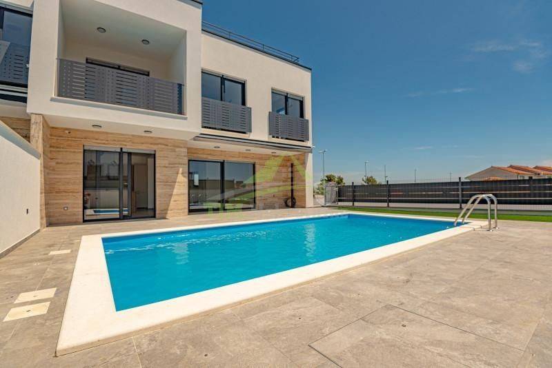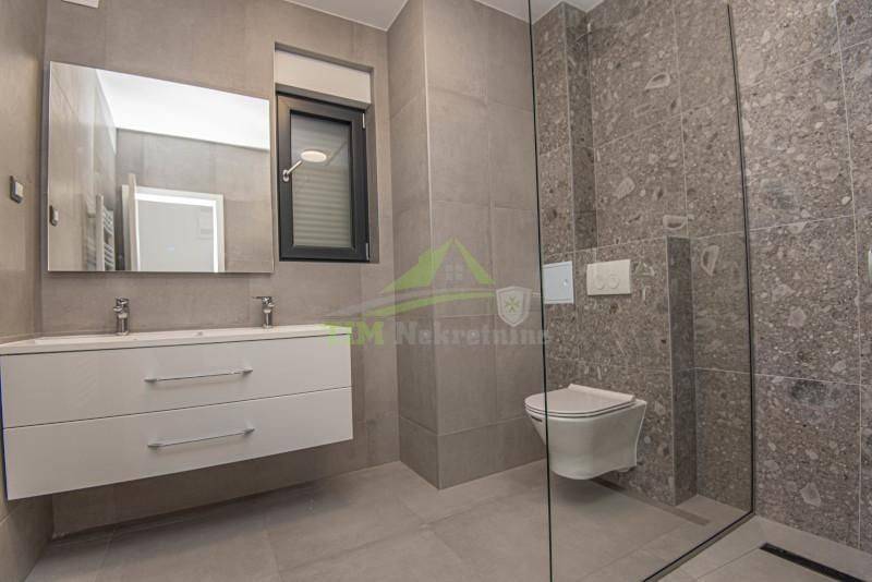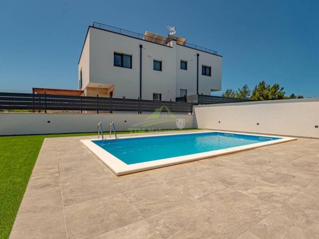 - kuhinjom s kuhinjskim otokom izrađenom po mjeri;- aluminijska stolarija s roletama na elektronskim podizačima;- podno grijanje u kupaonicama;- klima uređaj u svakoj zasebnoj prostoriji;- solarni kolektor za toplu vodu i spremnik od 300 l;- bazen površine 22 m2 s osnovnom opremom, bazen obložen folijom s pokrivačem za bazen- vanjski tuš sa spremnikom tople vode na solarno grijanje- bio-pročišćivač i upojni bunar za odpadne vode;- tenda na elektronski pogon;- video nadzor s dvije vanjske pozicije;- protuprovalna vrata s kontrolom ulaza (otisak prsta i šifranik);- dio fasade u prizemlju obložen prirodnim kamenom. RASPORED:PRIZEMLJE:- predsoblje- kuhinja sa blagovaonicom i dnevnim boravkom- spremište- gostinski WC- unutarnje stubište za 1. kat