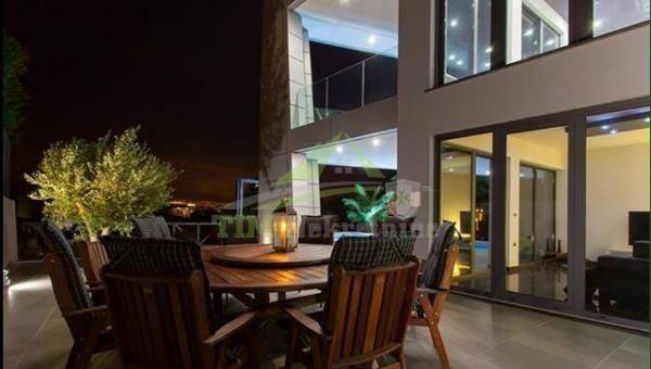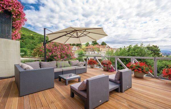 Okućnica same vile je hortikulturalno uređena, travnati dio je dodatno obogaćen visokim palmama i ukrasnim raslinjem, a samu okućnicu posebnom čini veliki bazen sa prostranom terasom za sunčanje, koja je ograđena INOX ogradom. Svaki stan ima veliku prostranu terasu, sa koje se proteže prekrasan pogled na more; dok centralni stan koji se proteže na tri etaže na terasi na 2. katu dodatno ima i jacuzzi.