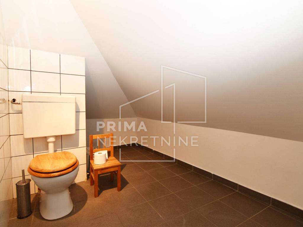 Na donjoj etaži nalazi se predsoblje, open space dnevni boravak i blagovaonica, kuhinja s francuskim balkonom, dvije prostrane spavaće sobe i velika kupaonica.