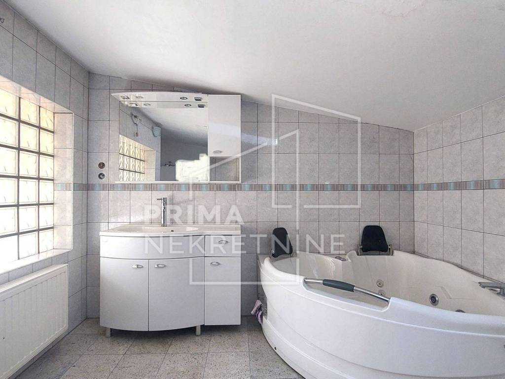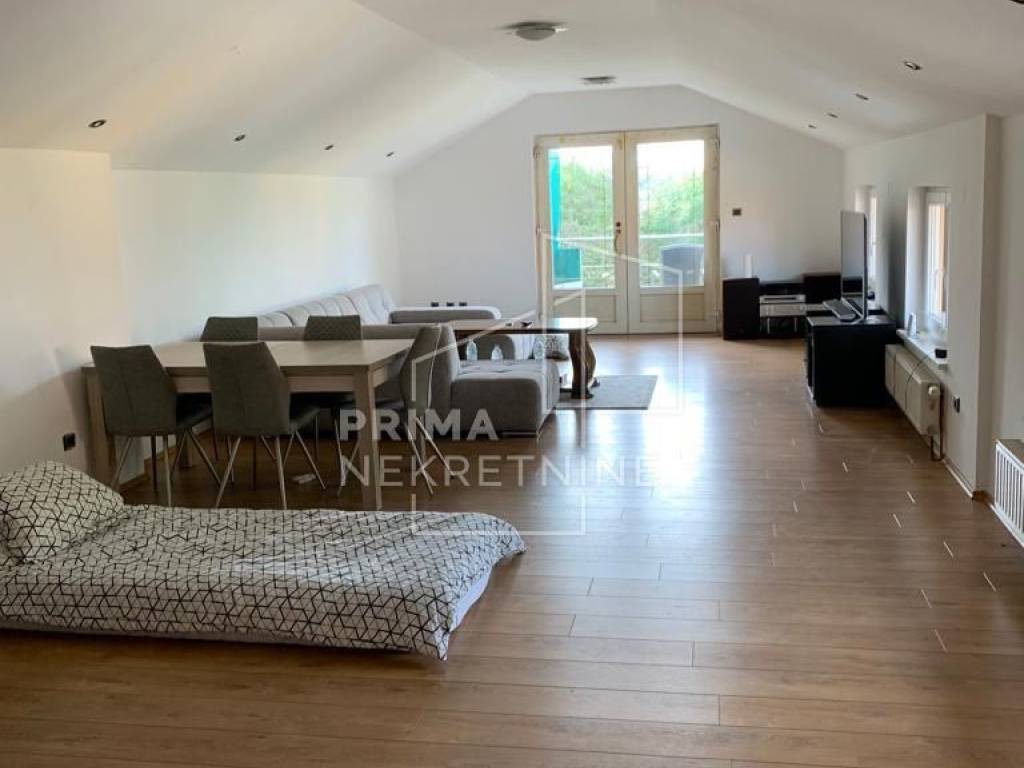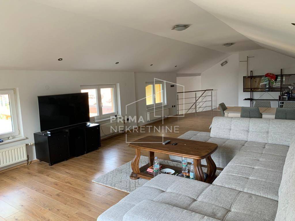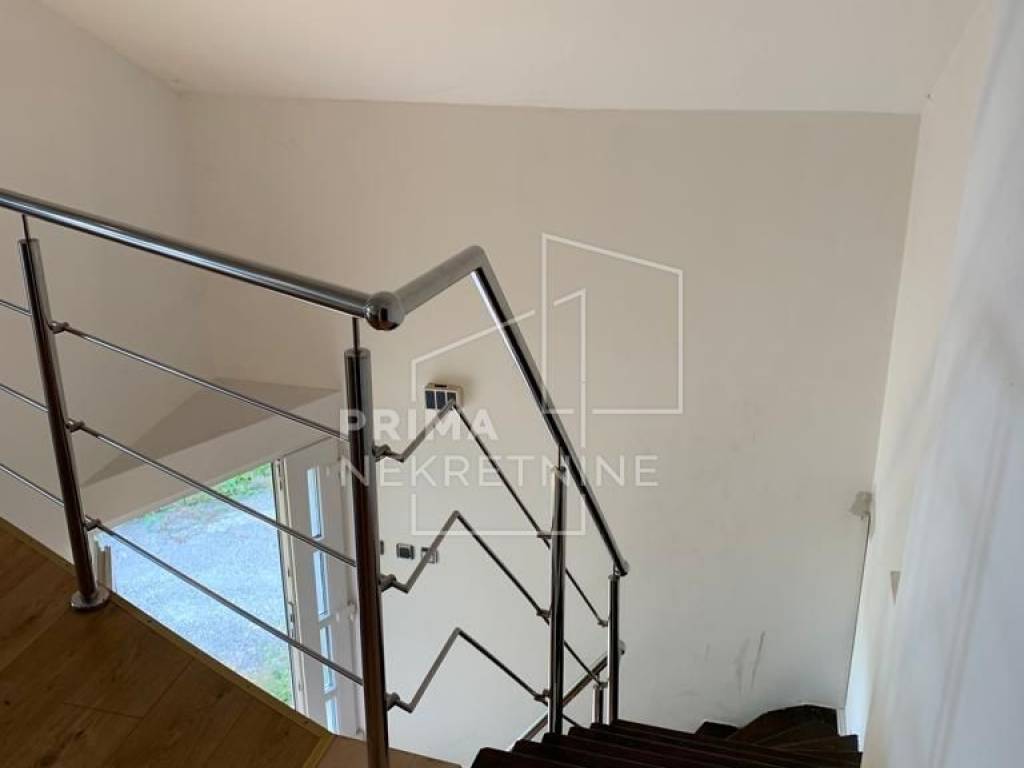 Veći stan površine 140 m2 sastoji se od dnevnog boravaka, kuhinje, wc-a, kupaonice u prizemlju te dvije sobe, veće s izlazom na balkon i još jedne manje sobe, na katu.