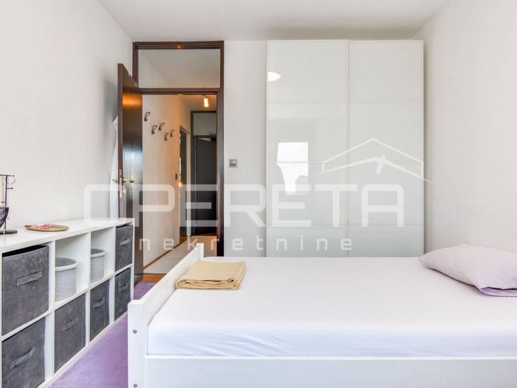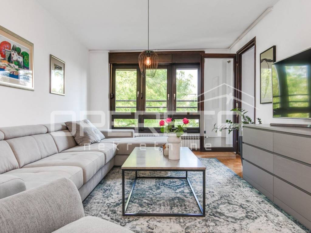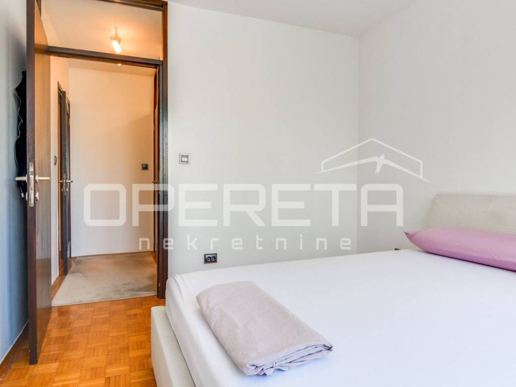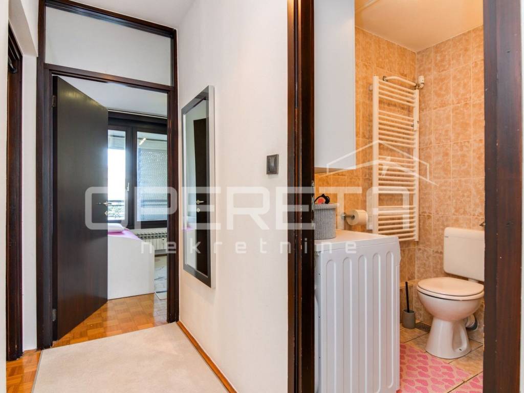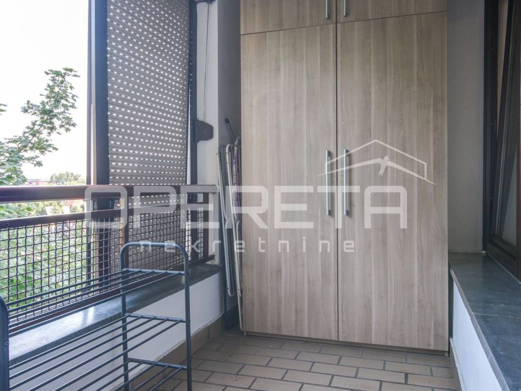 U vrlo dobrom stanju prostrani 4-soban stan koji se sastoji od ulaznog hodnika gdje je smještena blagovaonica, kuhinje, dnevnog boravka s izlazom na lođu, 3 spavaće sobe, kupaonice s WC-om, odvojenog WC-a te ostave.