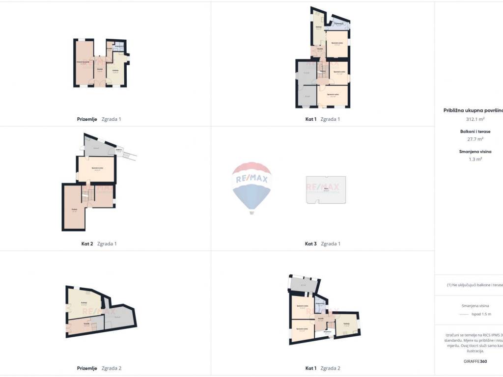 Ukupna tlocrtna površina iznosi 183 m², a ukupna razvijena površina iznosi 335 m² raspoređenih na tri etaže. Ukupno se u objektima nalazi 18 prostorija, od čega je 11 spavaćih soba.