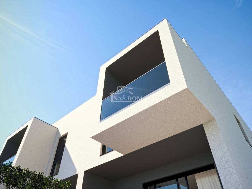 Vodice - **NOVOGRADNJA*'* prodaje se dvojna kuća s bazenom na mirnoj lokaciji , ukupne korisne površine 86,56m2 i sastoji se od dvije etaže : prizemlje +kat . Kući pripada i okućnica površine 150m2 s uključena dva parkirna mjesta . Kuća modernog izgleda graditi će se kvalitetnim materijalima i biti će opremljena prema posljednjem standardu gradnje : Stiropor fasada, pvc stolarija, rolete s električnim podizačima , komarnici , 2 klime , električno podno grijanje kroz čitav stan , kvalitetne podne obloge , moderne kupaonske sanitarije , osnovna oprema za bazen...