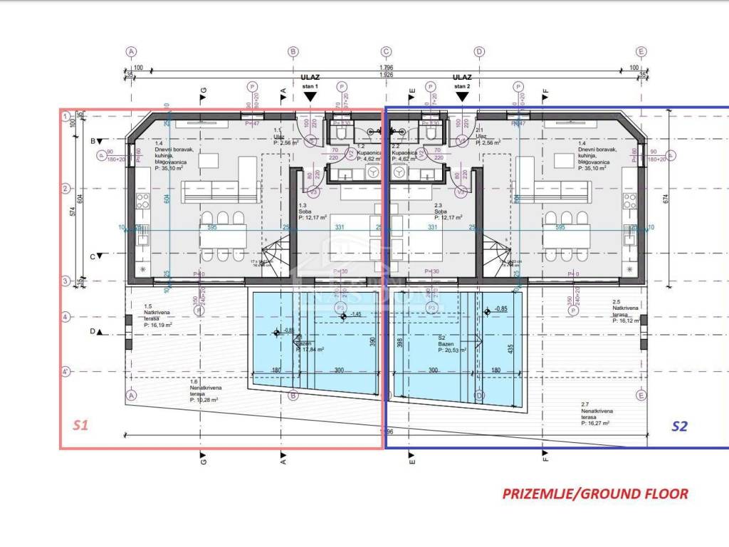 S2 kuća neto stambene površine 130.30 m2 ima dvije etaže: prizemlje+kat . Prizemlje se sastoji od ulaz, kupaonica , spavaća soba , kuhnja s blagovaonicom i dnevni boravak s izlazom na natkrivenu terasu i bazen. Unutarnjim stubištem se id na kat kuće koji se sastoji od hodnik, kupaoniica , dvije spavaće sobe , natkrivena terasa, i master spavaća soba s vlastitom kupaonicom i izlazom na balkon . Kući pripada odgovarajući do okućnice i parkirno mjesto.