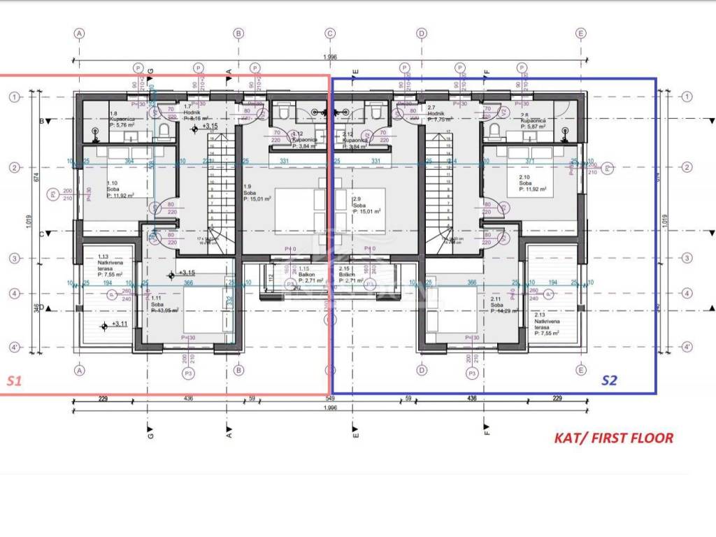 S1 KUĆA neto stambene površine 128.87 m2 ima dvije etaže: prizemlje +kat. Prizemlje se sastoji od ulaz, kupaonica , spavaća soba , kuhnja s blagovaonicom i dnevni boravak s izlazom na natkrivenu terasu i bazen. Unutarnjim stubištem se id na kat kuće koji se sastoji od hodnik, kupaoniica , dvije spavaće sobe , natkrivena terasa, i master spavaća soba s vlastitom kupaonicom i izlazom na balkon . Kući pripada odgovarajući do okućnice i parkirno mjesto.