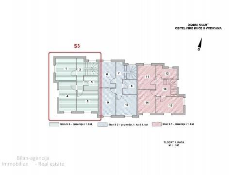 U prizemlju stana oznake S3 nalazi se kupaonica, dnevni boravak, blagovaona, kuhinja, stepenice za na kat.