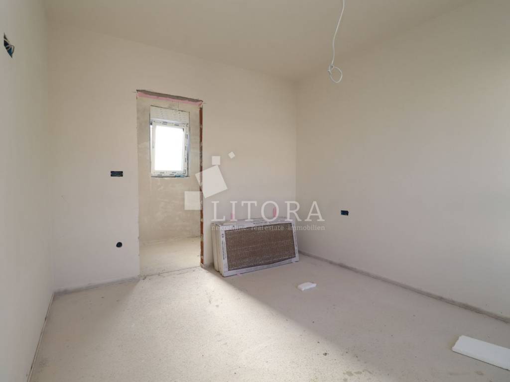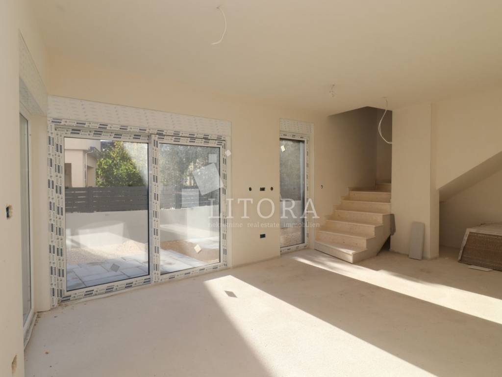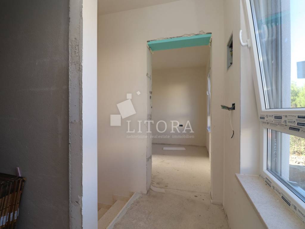 Žaborić – 3. red do mora obiteljska dvojna kuća moderne arhitekture na mirnoj lokaciji. Kuća ima dvije etaže (prizemlje + 1. kat), s ukupnom korisnom površinom od 135,72 m². Zelena površina površine 76,59 m2, velika terasa, 2 parkirna mjesta. Prizemlje se sastoji od predsoblja, spavaće sobe, kupaonice, te dnevnog boravka sa kuhinjom i blagovaonicom sa izlazom na terasu površine 23,15 m2. Unutarnje stepenice vode na 1. kat gdje se nalazi vešeraj, dvije spavaće sobe svaka sa vlastitom kupaonicom, terasa. Kuća je opremljena: visokokvalitetnim keramičkim oblogama, klima-uređaji u svim prostorijama, staklene ograde, podno grijanje u dnevnom boravku i kupaonicama. Udaljenost do plaže je 70 m, 450m do centra mjesta.