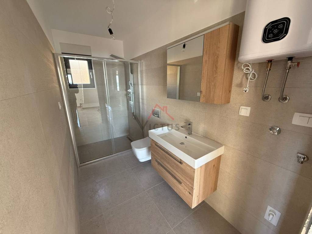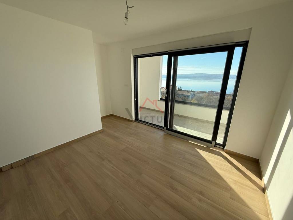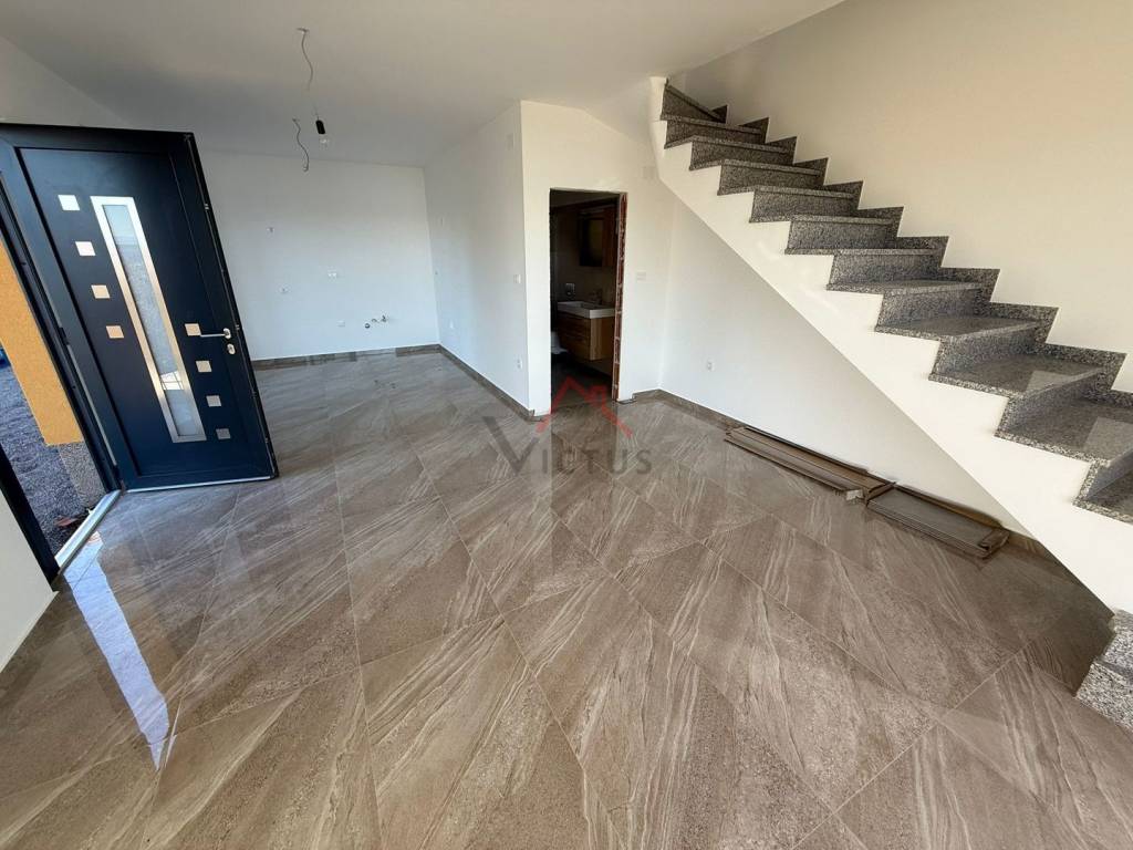 Prodajemo dvoetažni stan od 85 m2 u novogradnji. Stan se proteže na dvije etaže koje su povezane unutarnjim stepenicama. Nalazi se u objektu sa samo dvije stambene jedinice. U prizemlju stana nalaze se kupaonica, kuhinja s blagovaonom i dnevni boravak s izlazom na terasu. Na katu se nalaze kupaonica i dvije spavaće sobe koje također imaju izlaz na terasu sa koje se pruža panoramski pogled na more i otok Krk. Stanu u vlasništvu pripadaju i dio okućnice te parkirno mjesto.