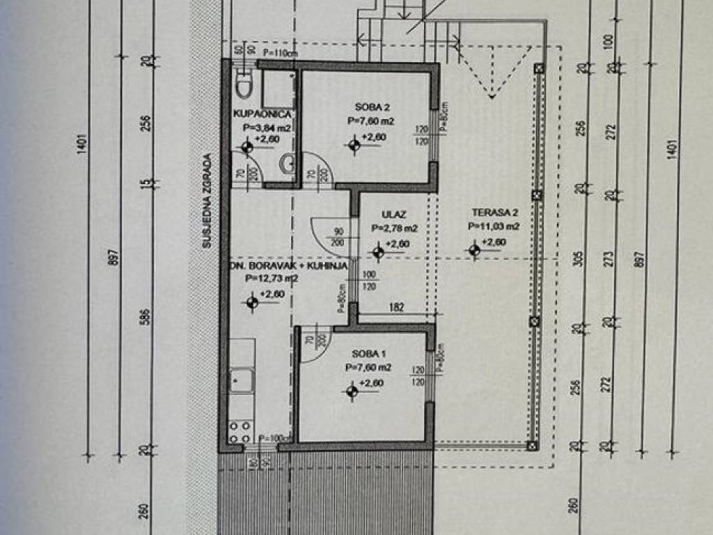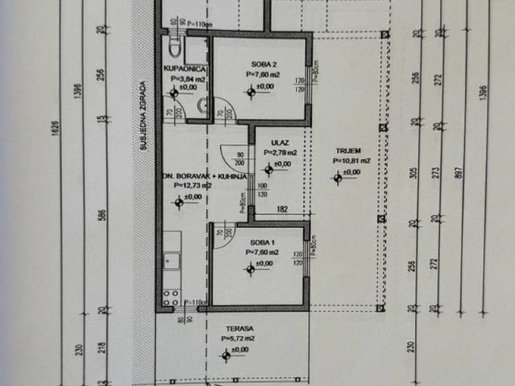 Kat: dvije spavaće sobe, dnevni boravak + kuhinja + blagovaona, hodnik, kupaonica i dvije terase.