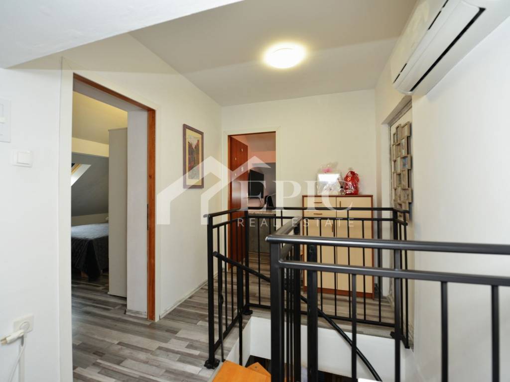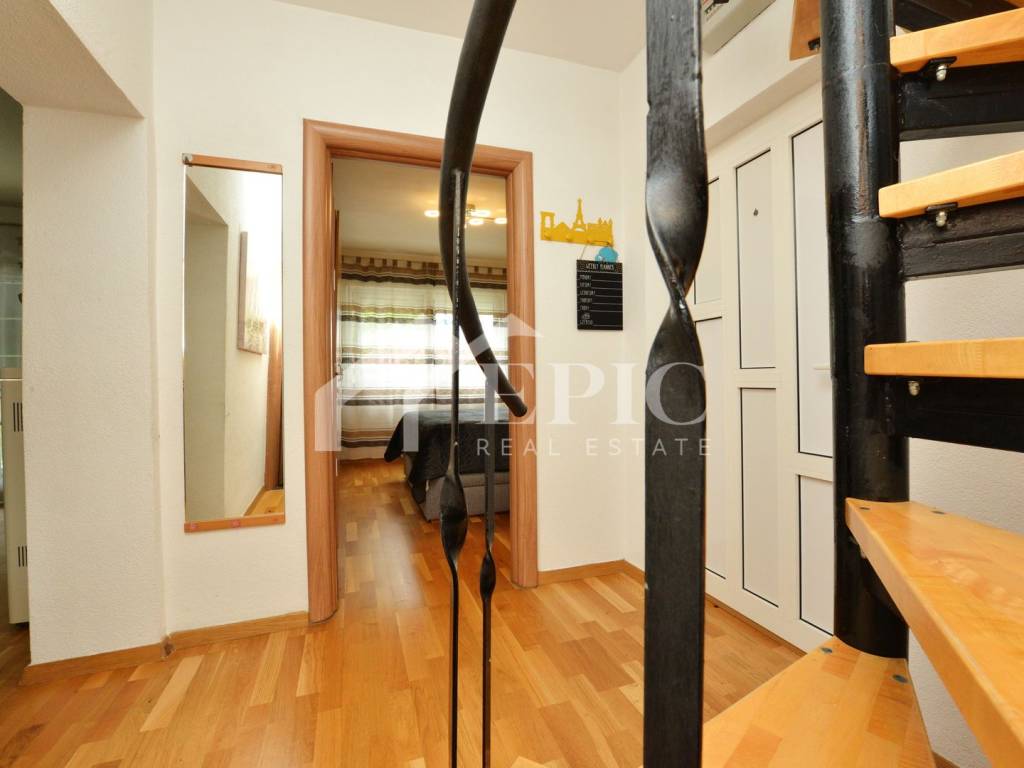 Na prvoj etaži stana nalazi se hodnik sa spiralnim stepenicama drvo metal, prostran dnevni boravak, blagovaona sa kuhinjom sa izlazom na poluzatvoreni balkon sa gril roštiljem, drugi južni balkon sa pogledom na dvorište, zelenilo i more, jedna spavaća soba sa bračnim boxspring krevetom i garderobnim ormarom, kupaonica sa wc-om.