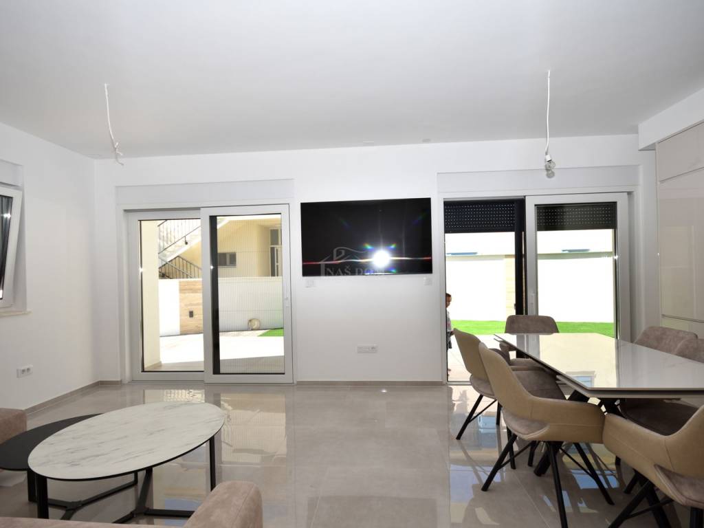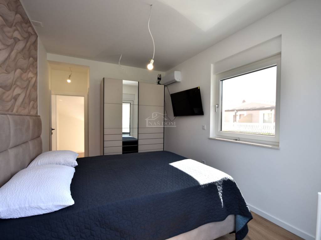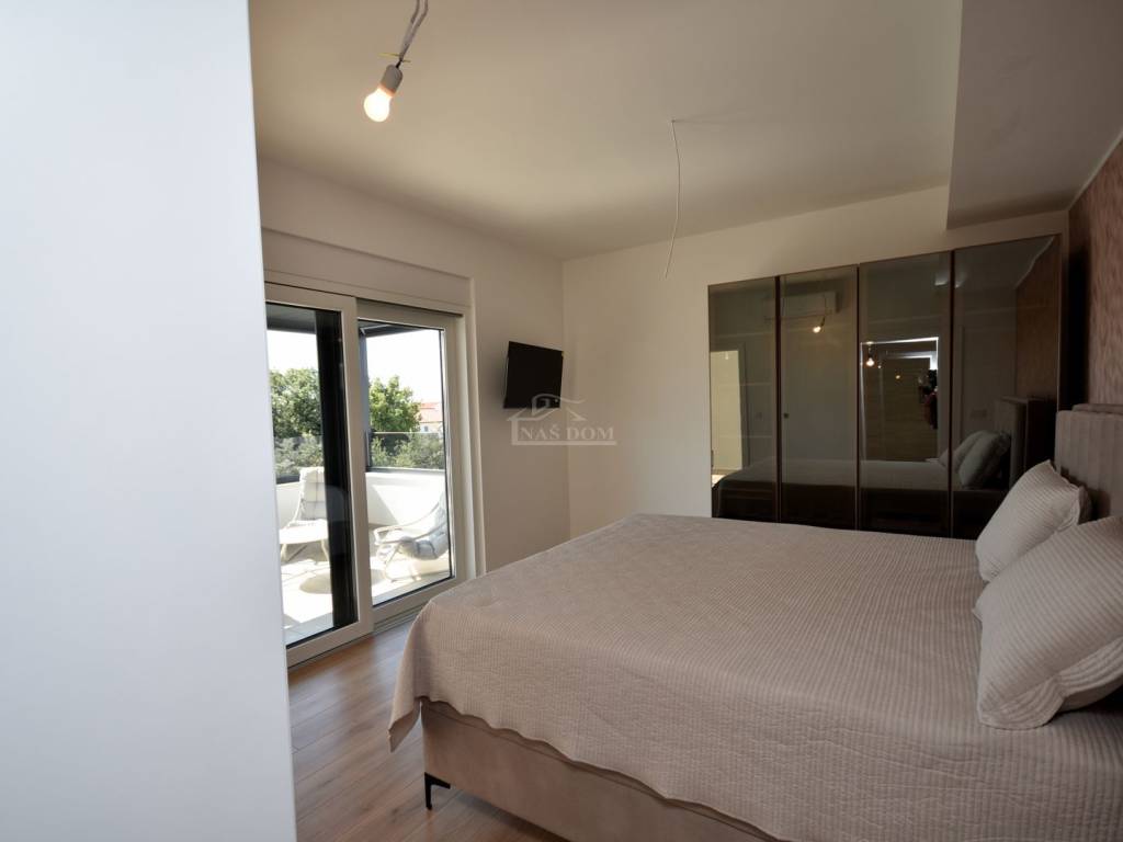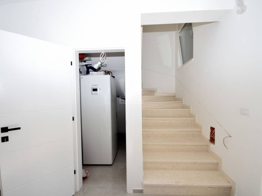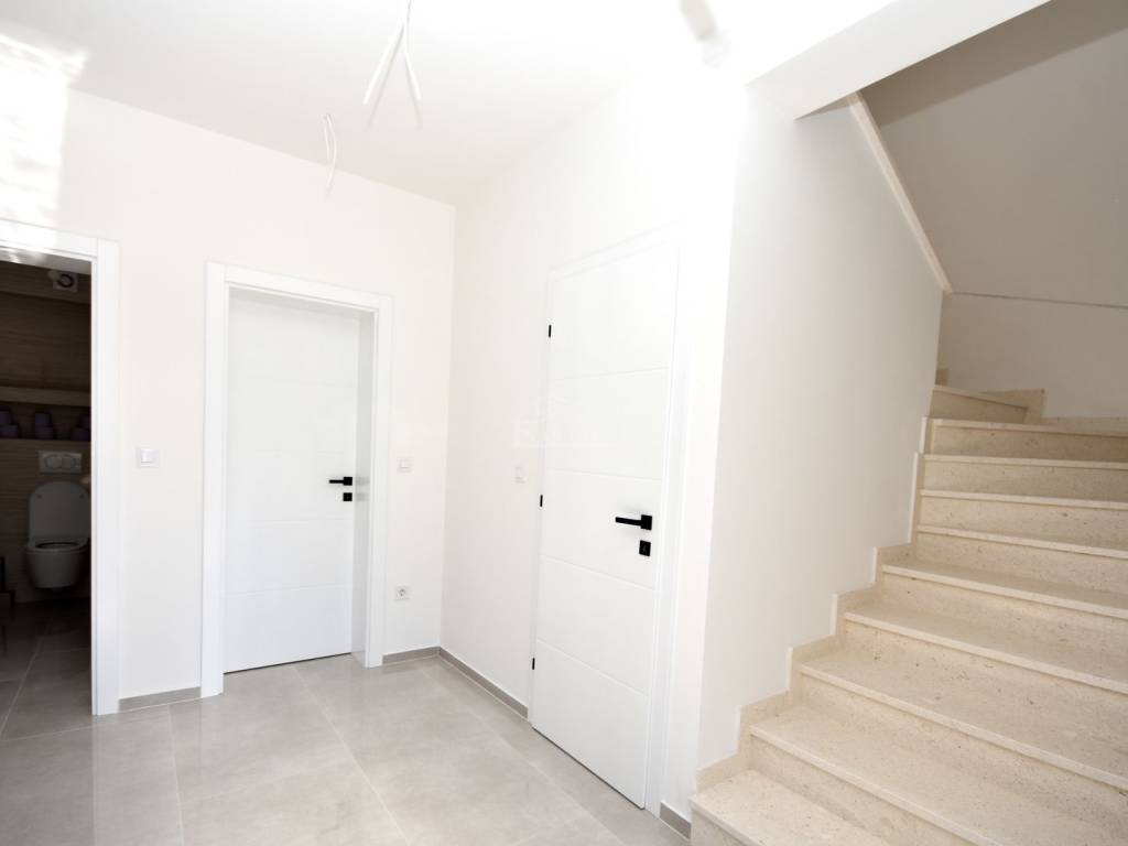Vodice, Srima- **NOVOGRADNJA** prodaje se kompletno namještena i opremljena dvojna kuća modernog izgleda i ima tri etaže: prizemlje+kat +II.kat. Kuća je sagrađena 2025 godine kvalitetnim materijalima i opremljena prema posljednjim standardima gradnje. Od opreme izdvajamo: stiropor fasada 10 cm, PVC stolarija s roletama, klizne stijene, kvalitetne keramičke pločice, moderne kupaonske sanitarije, vodeno podno grijanje na struju +toplinska pumpa, predinstalacija za solarne panele, internet/tv instalacije u spavaćim sobama i dnevnom boravku, klime u spavaćim sobama i dnevnom boravku, laminati u spavaćim sobama, parking popločan opločnikom, postavljena umjetna trava u vrtu..