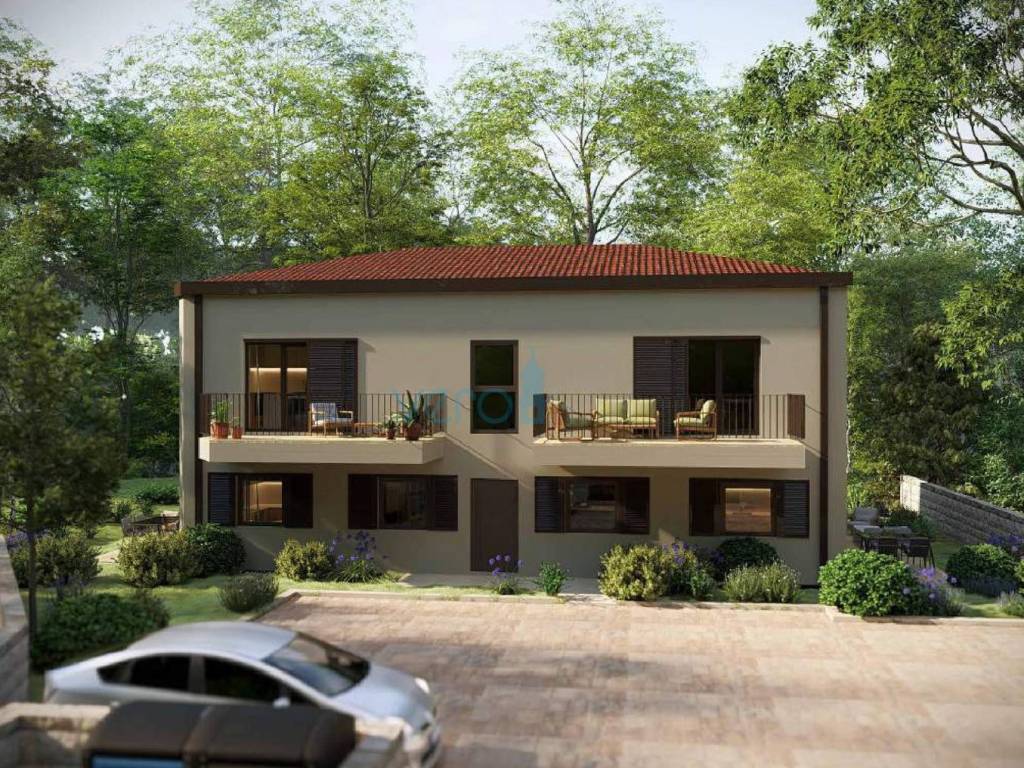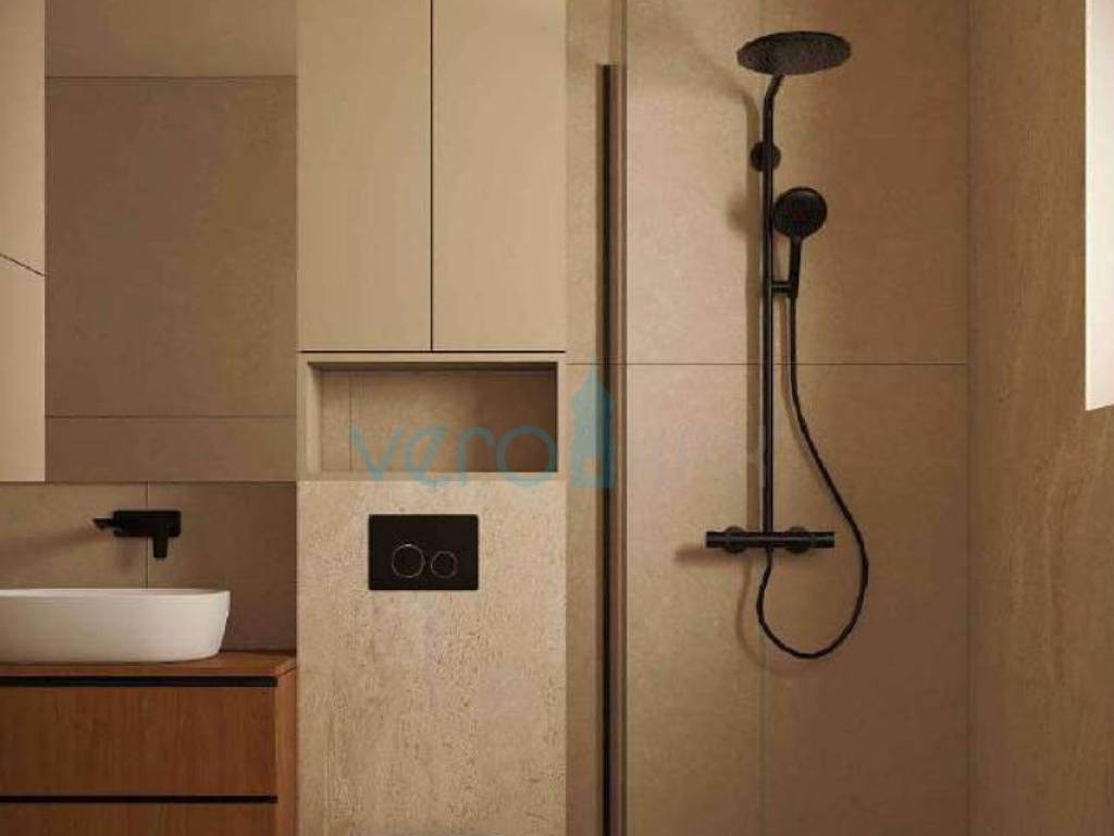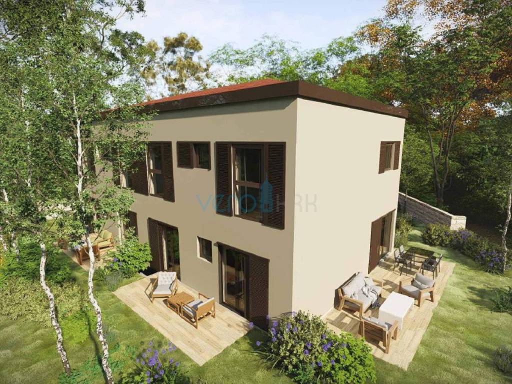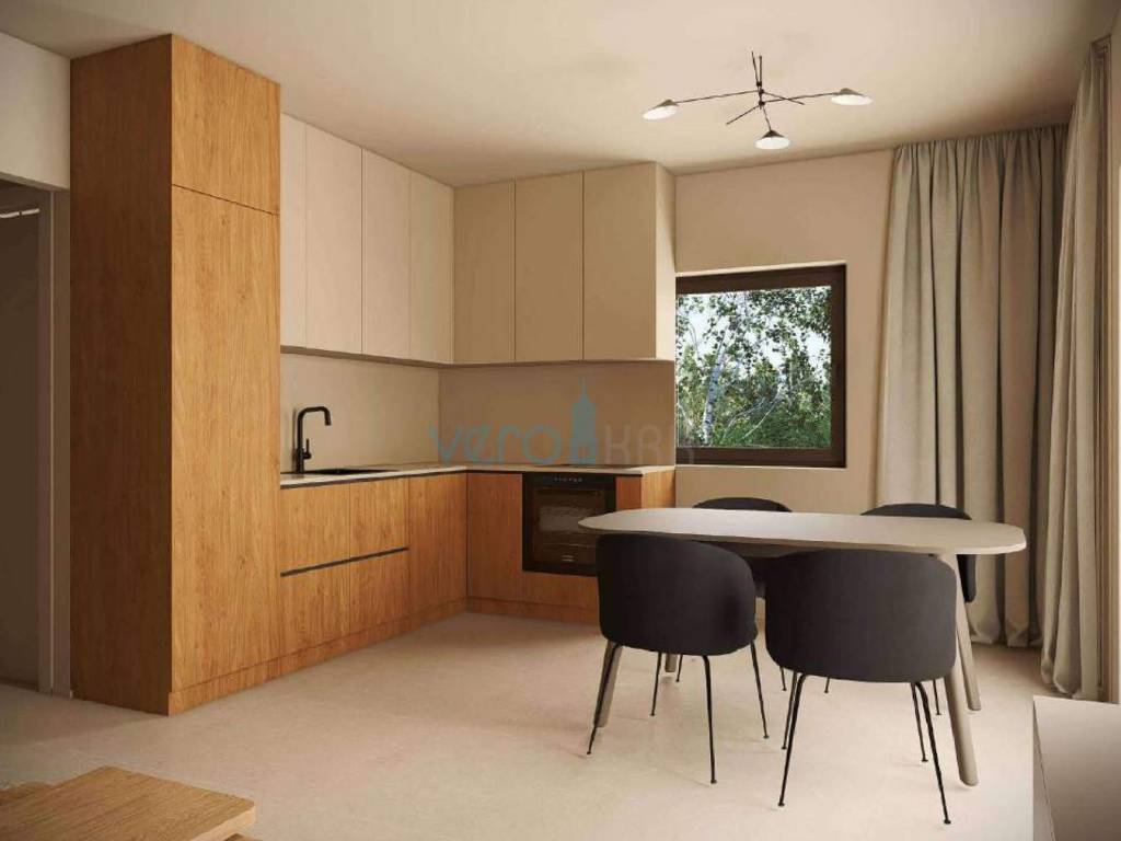 Posredujemo u prodaji stana na katu moderne zgrade sa ukupno četiri stambene jedinice u blizini centra grada Omišlja na otoku Krku. Stan ima stambenu površinu od 57 m2, koju čine dvije spavaće sobe, hodnik, kupaonica, kuhinja s blagovaonicom i dnevni boravkom u zajedničkoj prostoriji. Stan če biti opremljen s vlastitom dizalicom topline Daikin Perfera za grijanje i hlađenje, visokokvalitetna fasada STO, troslojna stakla i podizno-klizne stijene te Alu grilje, keramika I. klase sa sanitarnom opremom I. klase, Alupex sustav dovoda vode, Semmelrock opločnici za okoliš te predpriprema za fotonaponsku elektranu. Stanu pripada i spremište 10,90 m2 uz stan, dva parkirna mjesta na ograđenoj okućnici te balkon od 11,65 m2. Ukupna kvadratura ove nekretnine s unutarnjim i vanjskim površinama iznosi 73,52 m2.