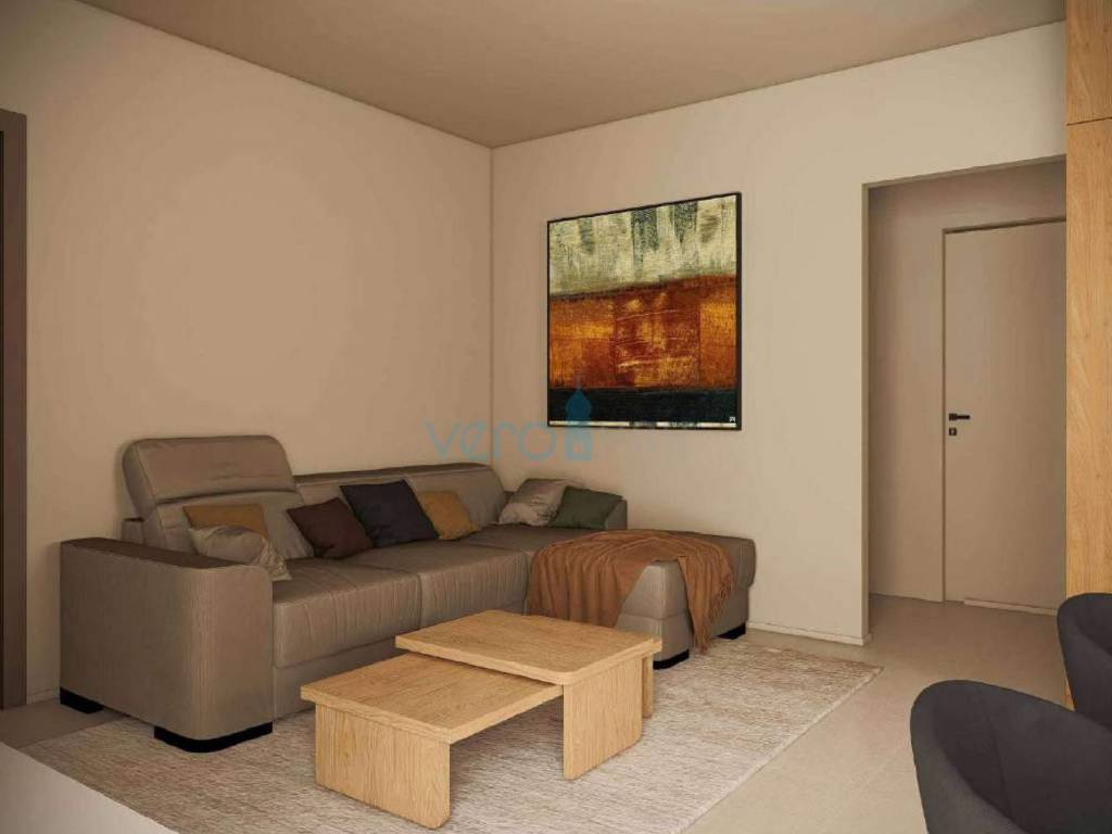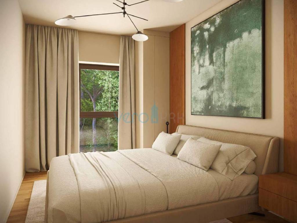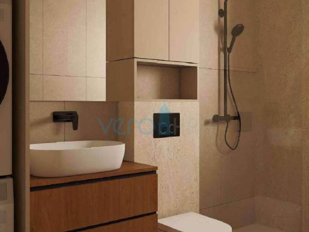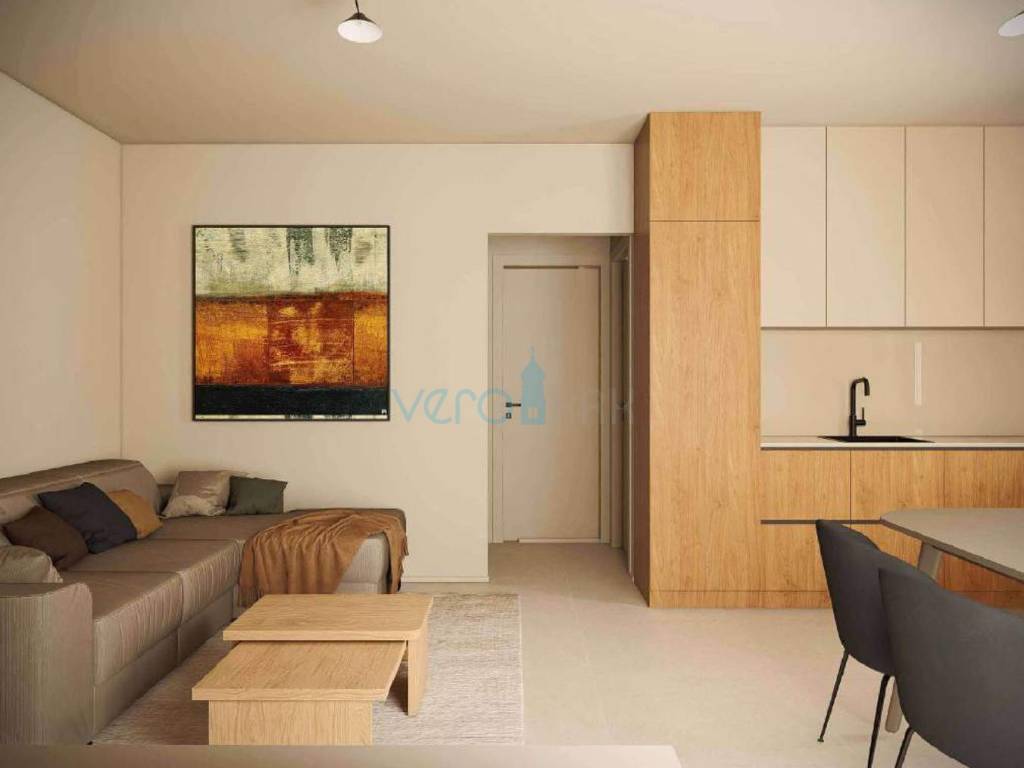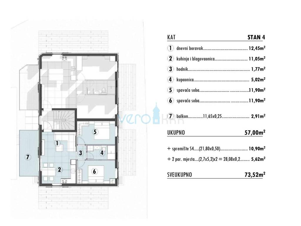 Posredujemo u prodaji stana na katu moderne zgrade sa ukupno četiri stambene jedinice u blizini centra grada Omišlja na otoku Krku. Stan ima stambenu površinu od 57 m2, koju čine dvije spavaće sobe, hodnik, kupaonica, kuhinja s blagovaonicom i dnevni boravkom u zajedničkoj prostoriji. Stan če biti opremljen s vlastitom dizalicom topline Daikin Perfera za grijanje i hlađenje, visokokvalitetna fasada STO, troslojna stakla i podizno-klizne stijene te Alu grilje, keramika I. klase sa sanitarnom opremom I. klase, Alupex sustav dovoda vode, Semmelrock opločnici za okoliš te predpriprema za fotonaponsku elektranu. Stanu pripada i spremište 10,90 m2 uz stan, dva parkirna mjesta na ograđenoj okućnici te balkon od 11,65 m2. Ukupna kvadratura ove nekretnine s unutarnjim i vanjskim površinama iznosi 73,52 m2.