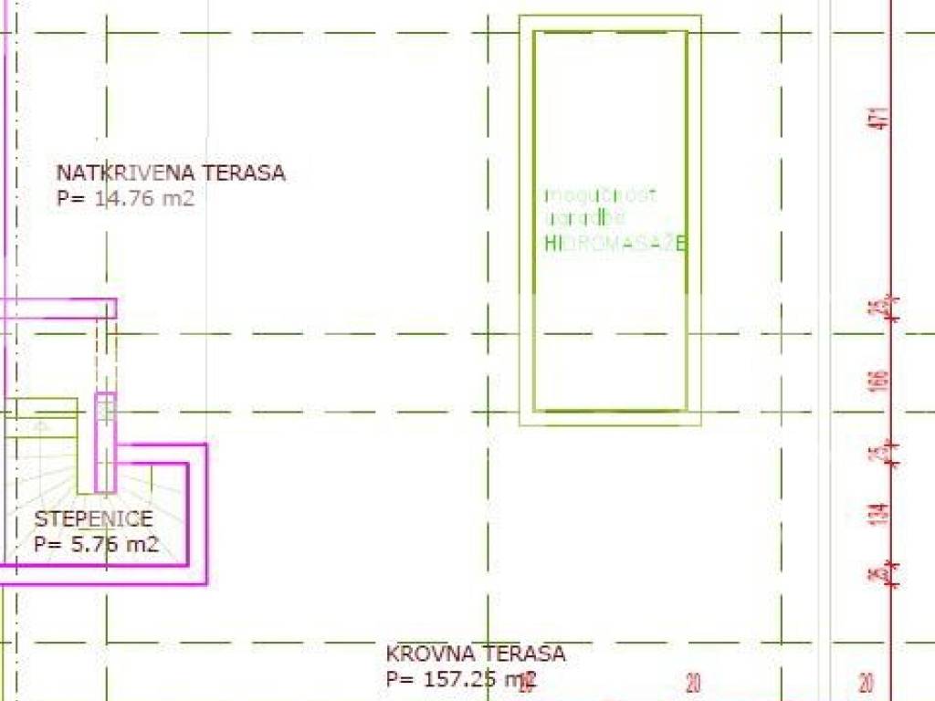 Unutarnji prostor stana iznosi 102,53m2 uz natkrivenu terasu od dodatnih 35,49m2 i krovnu terasu s nenatkrivenim dijelom od 157,25m2 i natkrivenim dijelom od 14,76m2. Na krovnoj terasi se nalaze ljetna kuhinja i jacuzzi (Wellis). Pripada mu i jedno parkirno mjesto površine 12,84m2. Ukupna korisna površina stana iznosi 169,52 m2.