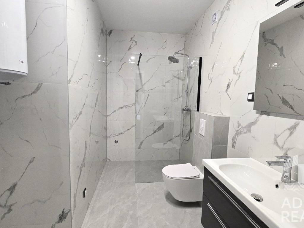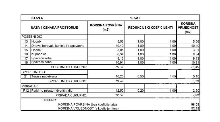 Na prodaju je prostrani dvosobni apartman S6 smješten na prvom katu manje stambene zgrade s ukupno šest stambenih jedinica. Apartman se sastoji od ulaznog prostora, kuhinje, blagovaonice i dnevnog boravka koji čine cjelinu, dvije spavaće sobe i kupaonice. Iz dnevnog boravka se izlazi na terasu površine 10 m2, idealnu za uživanje na svježem zraku. Sve prostorije su klimatizirane, a u kupaonicama je ugrađeno podno grijanje.