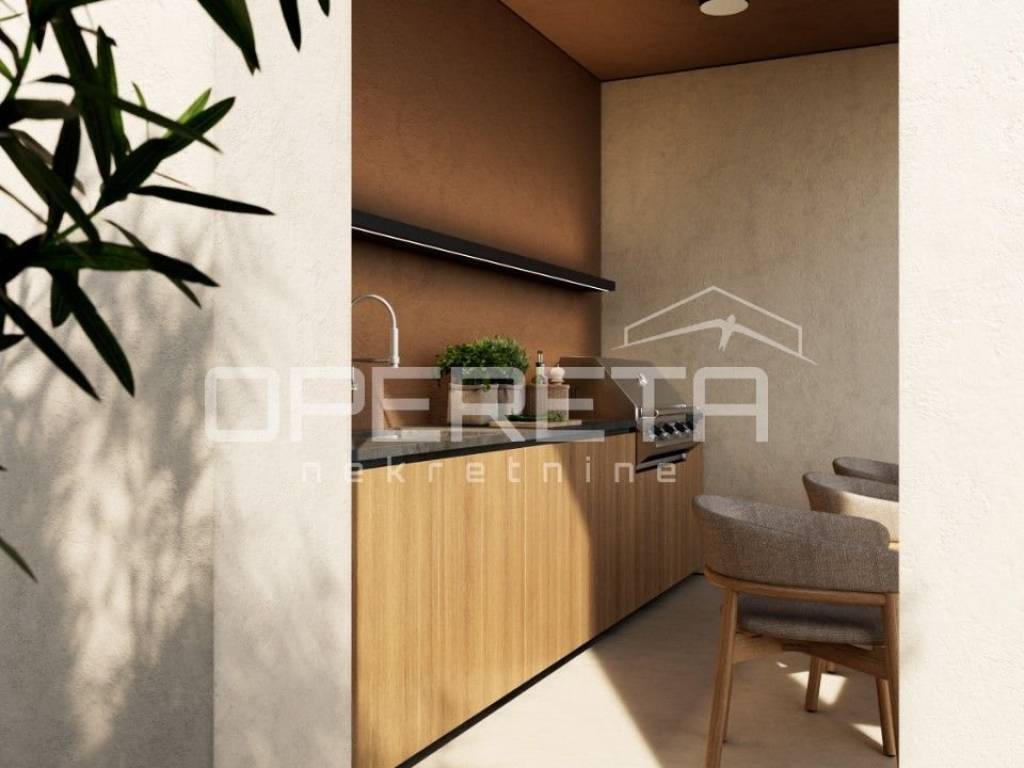 U prizemlju se smjestio open space dnevni boravak sa kuhinjom i blagovaonicom s izlazom na natkrivenu terasu gdje se nalazi ljetna kuhinja, ostava i toalet.