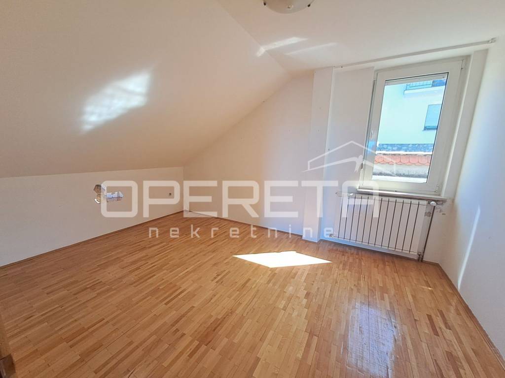 Na gornjoj, potkrovnoj etaži nalazi se stan od 103 m2 s velikim open space prostorom dnevnog boravka (56 m2), spavaćom sobom, kuhinjom s blagovaonicom, kupaonicom, te loggiom i balkonom. Ulaz na kat je kroz natkrivenu terasu. Ta terasa s ugrađenim kaminom je srce kuće i njen prekrasan dio. Prostor za druženje i boravak na zraku veći dio godine. Odmah pored je bazen od 26m2, a iza njega pomoćna kućica od 24m2. Uz kuću je garaža za dva auta. U podrumskoj etaži ( 36 m2) smješten je vinski podrum s prostorom za degustaciju i druženje.