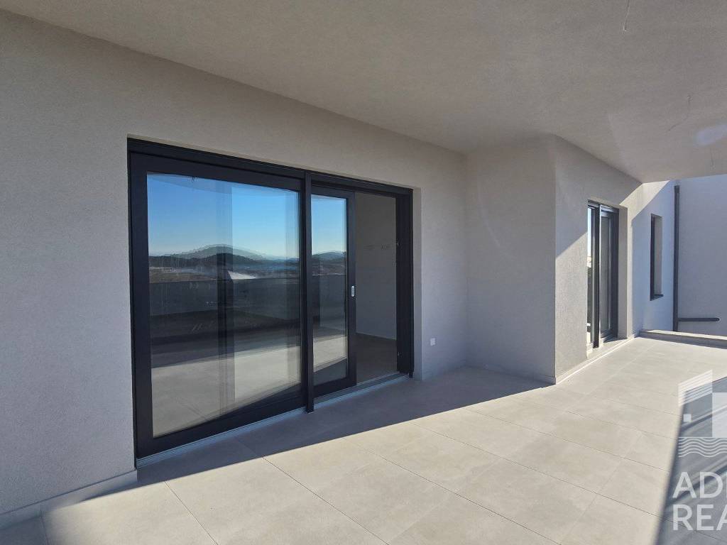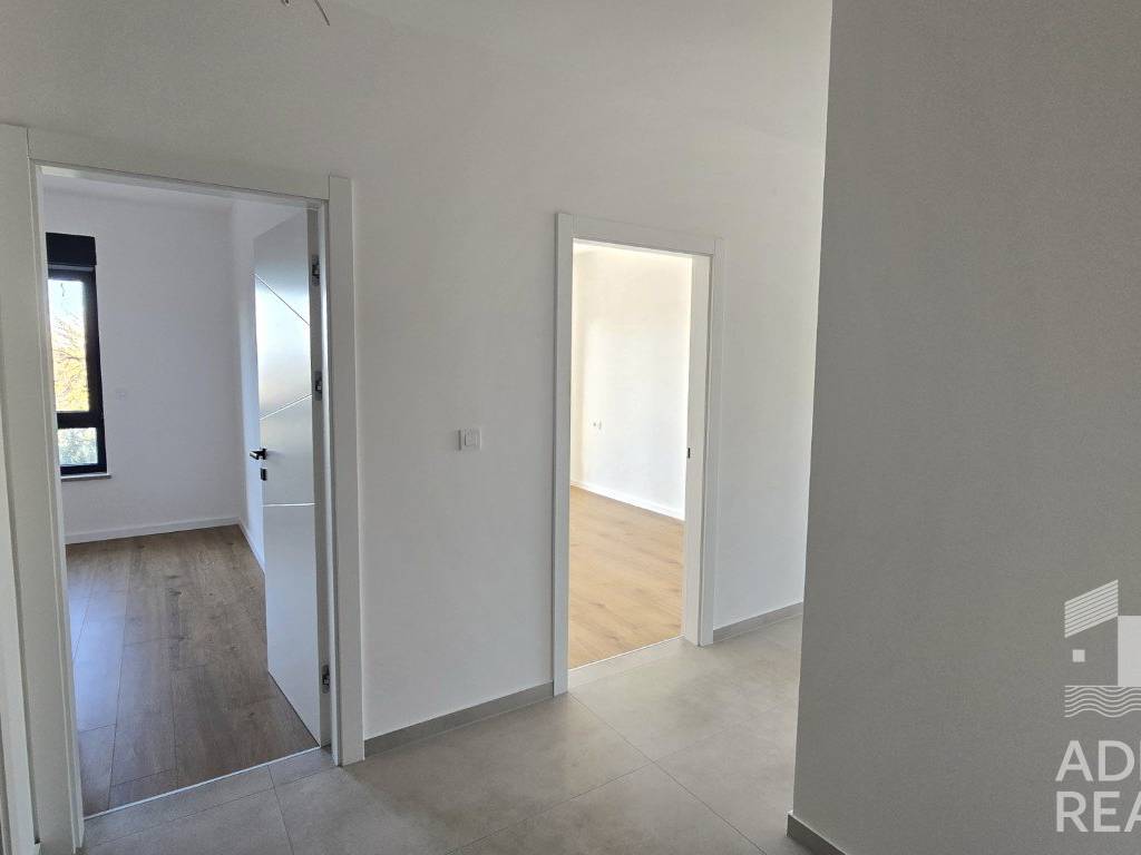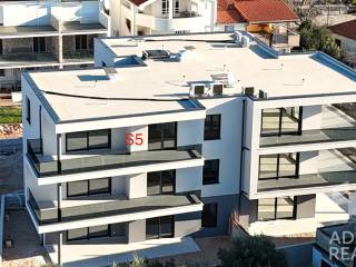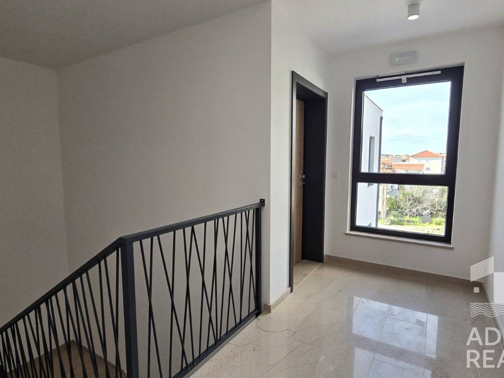 Apartmanu pripadaju dva parkirna mjesta, a izgrađen je s visokokvalitetnom opremom koja uključuje PVC stolariju s električnim podizačima roleta i komarnicima, podno grijanje u cijelom prostoru te klima uređaje u dnevnom boravku i spavaćim sobama. Podne obloge su kombinacija keramike i parketa, zajedničko stubište obloženo je kamenom, a terase imaju elegantne staklene ograde.