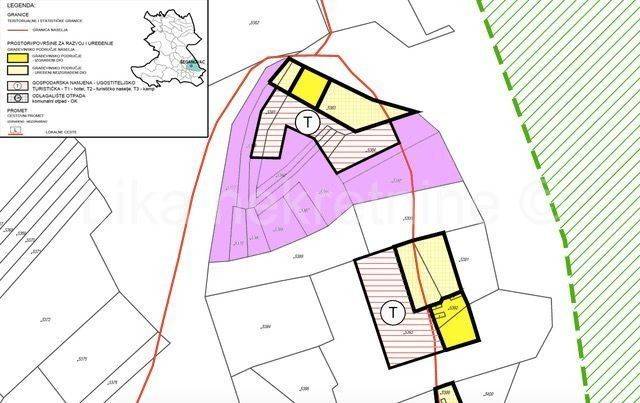 Okvirna kvadratura građevinskog dijela zemljišta je 10.000 m2, te isto tako 10.000 m2 turističke T zone.