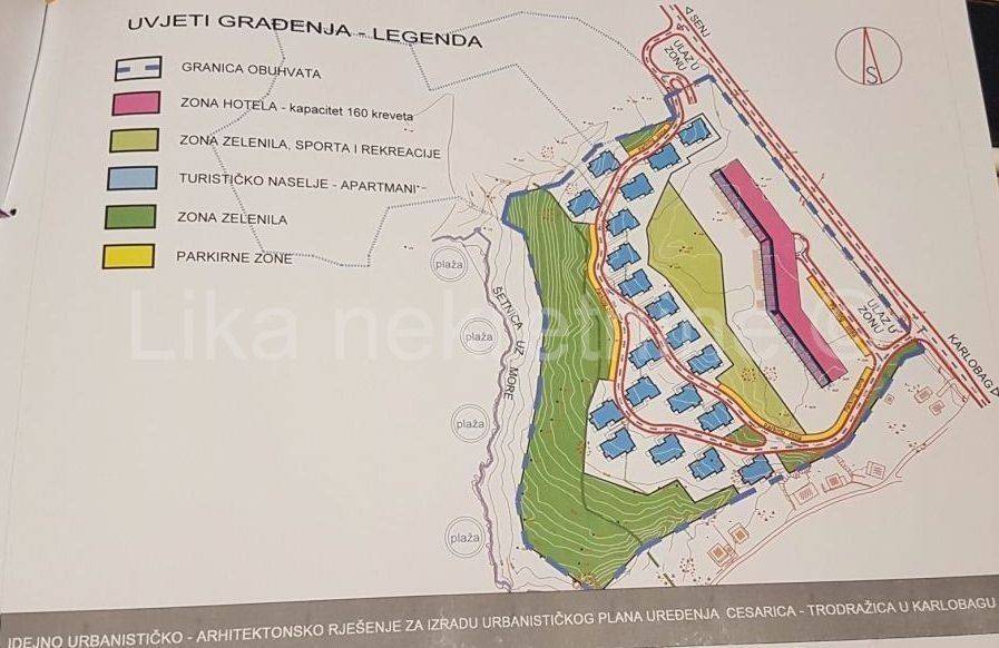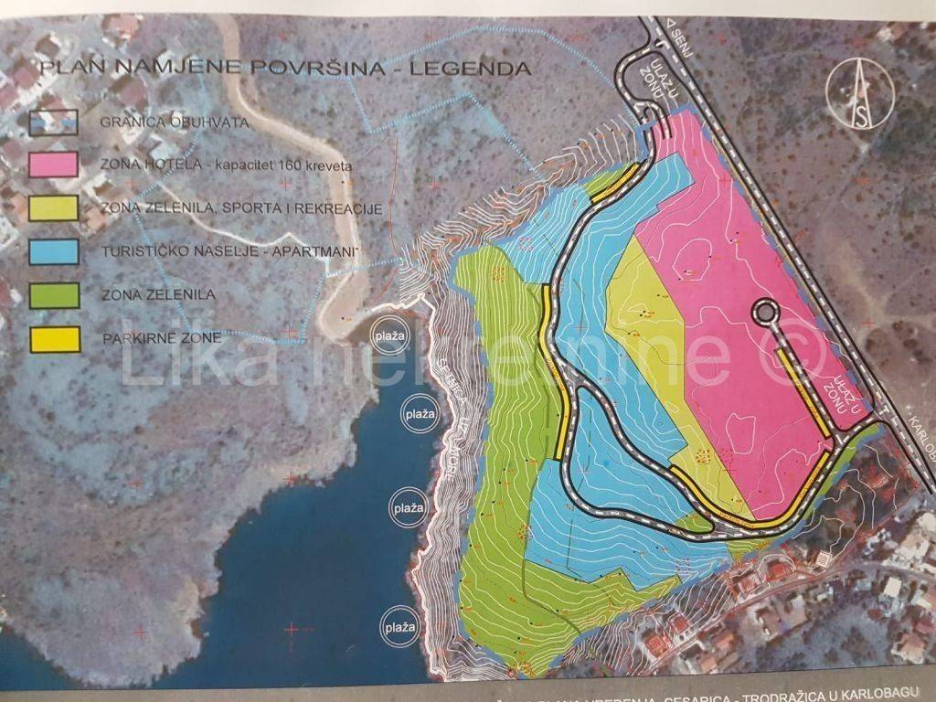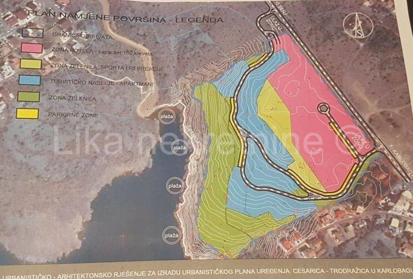 CESARICA, Trodražica ( KARLOBAG ) - građevinsko zemljište ugostiteljsko turističke namjene površine 68.366 m2 u komadu, prostire se od samog mora do magistralne ceste Karlobag - Senj. Postoji idealno urbanističko-arhitektonsko rješenje za izradu urbanističkog plana uređenja Trodražice. Mogućnost gradnje hotela, urbanih vila, apartmana, sportskih sadržaja...Uredno vlasništvo 1/1, bez tereta, vlasnik pravna osoba. Prodaje se u kompletu bez mogućnosti parcelacije, isplata odjednom - ne može na rate.